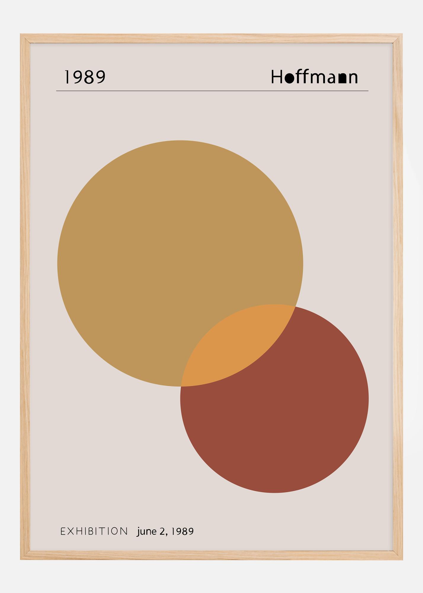 Questo poster minimalista e sofisticato rende omaggio alla mostra dell'artista astratto Hoffmann del 1989. Con un design elegante di cerchi sovrapposti in tonalità calde di marrone e ocra, questo poster crea una sensazione di retro e modernità. Il testo è discretamente posizionato per dare spazio al visivo, dove ogni elemento è accuratamente bilanciato per creare un'opera d'arte atmosferica e invitante.