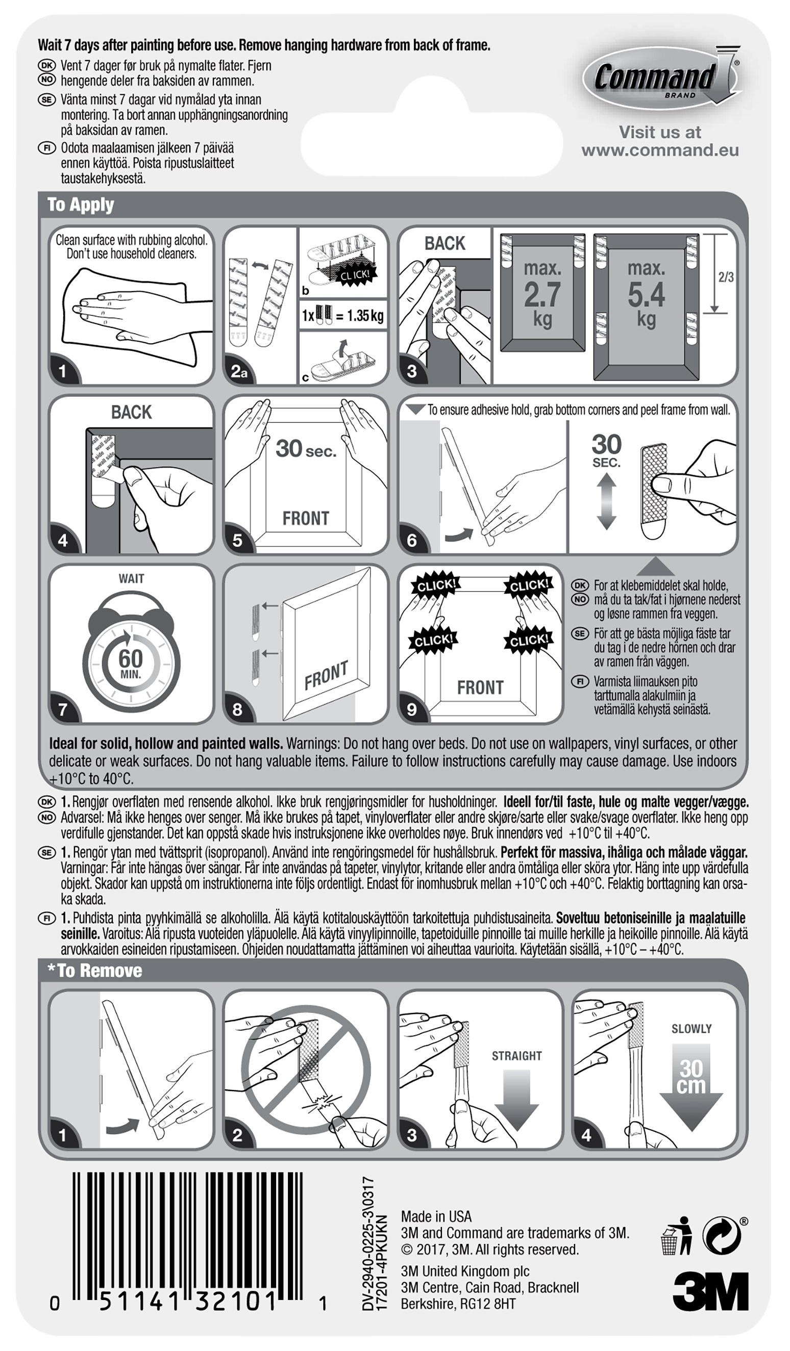 Questo pacchetto contiene 4 paia di strisce autoadesive che possono sostenere quadri fino a un massimo di 5 kg, con una dimensione fino a 45x60 cm.