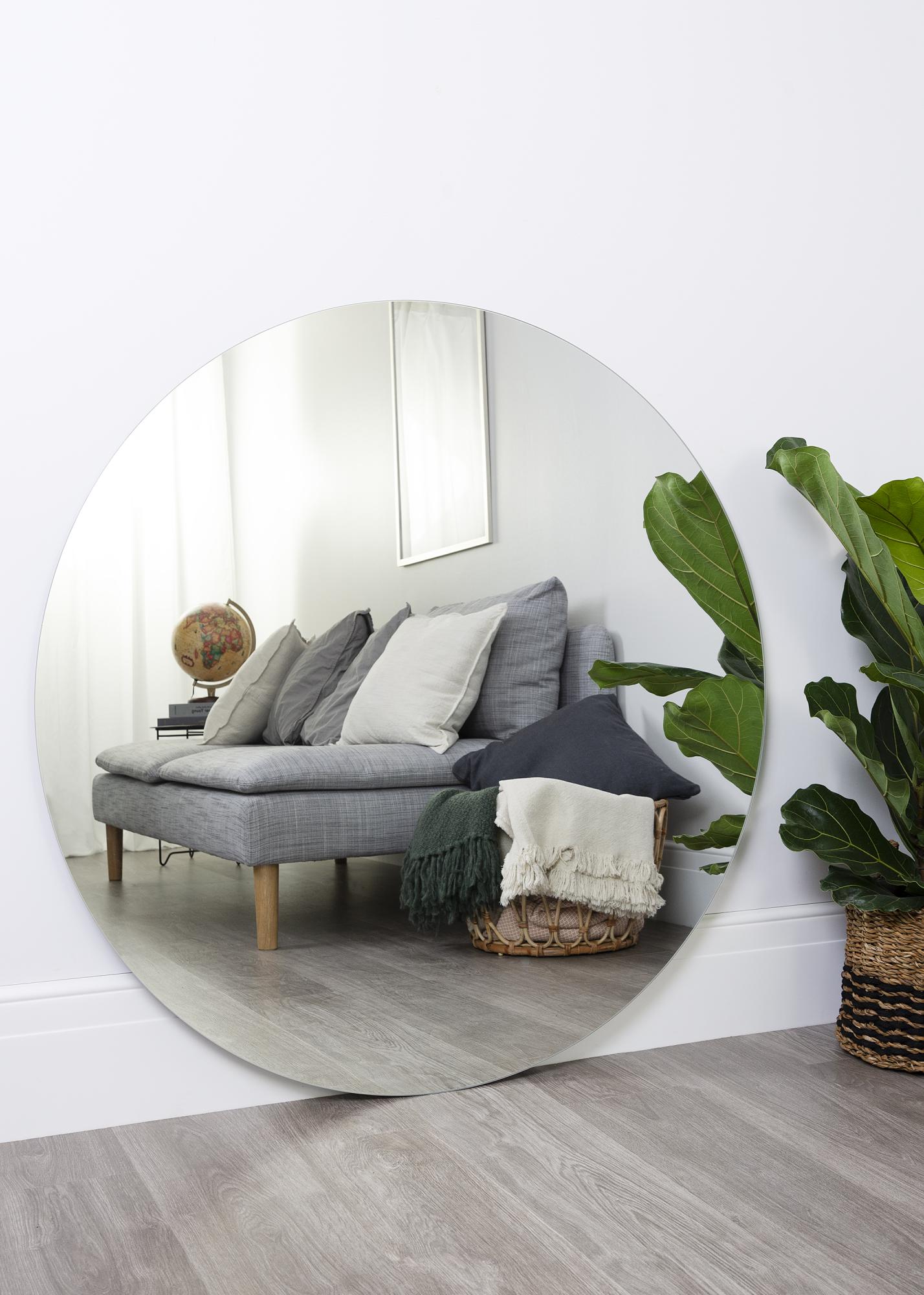 Specchio rotondo con diametro di 110 cm incluso in una serie di specchi rotondi. Lo specchio è estremamente sottile ed elegante e si adatta a tutti i tipi di stanze e stili di arredamento.