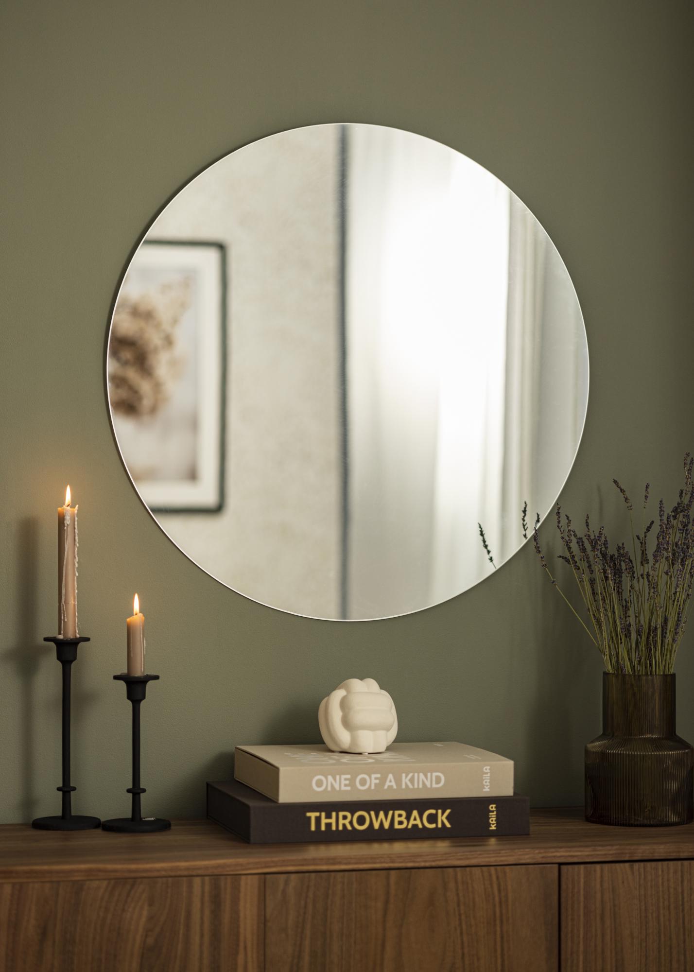 Specchio rotondo con diametro di 70 cm incluso in una serie di specchi rotondi. Lo specchio è estremamente sottile ed elegante e si adatta a tutti i tipi di stanze e stili di arredamento.