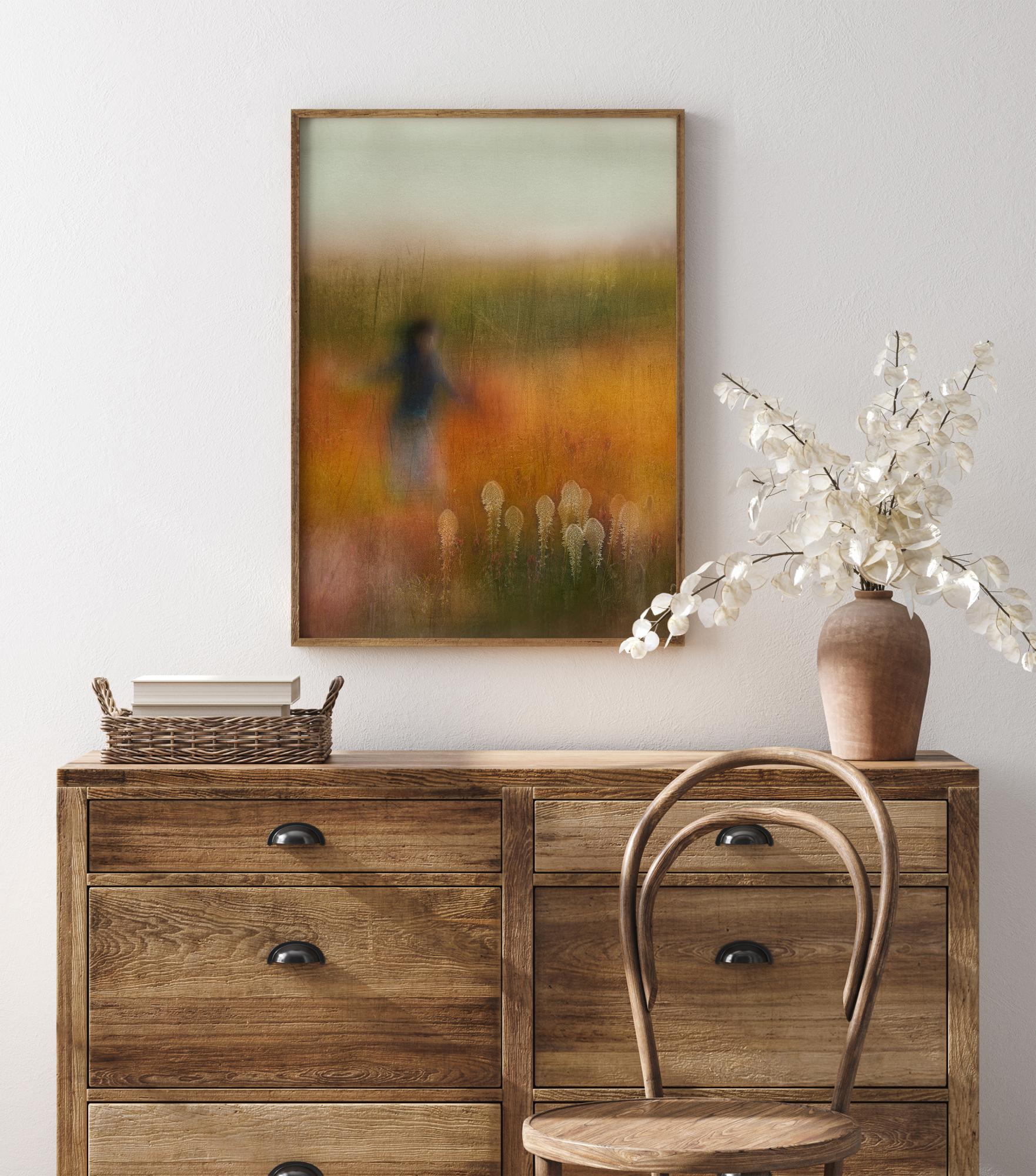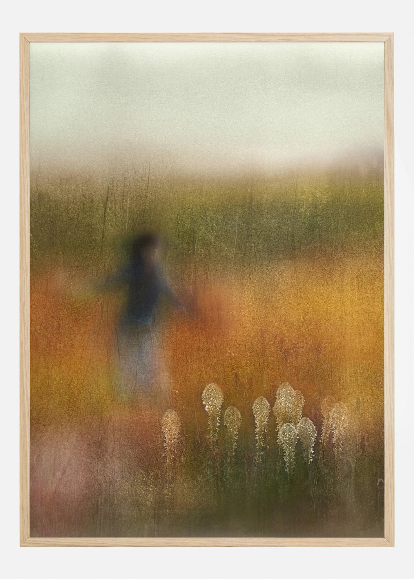 Un poster astratto con una ragazza tra l'erba alta. L'immagine sembra un dipinto morbido con colori gialli e verdi che evocano una sensazione primaverile. La ragazza sfocata si muove attraverso le forti pennellate nell'erba per creare movimento in tutta l'immagine. Appendila in casa tua per avere un fantastico punto di partenza per le conversazioni.