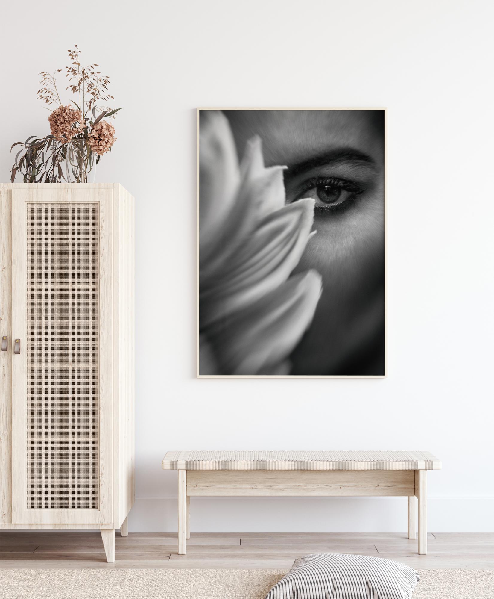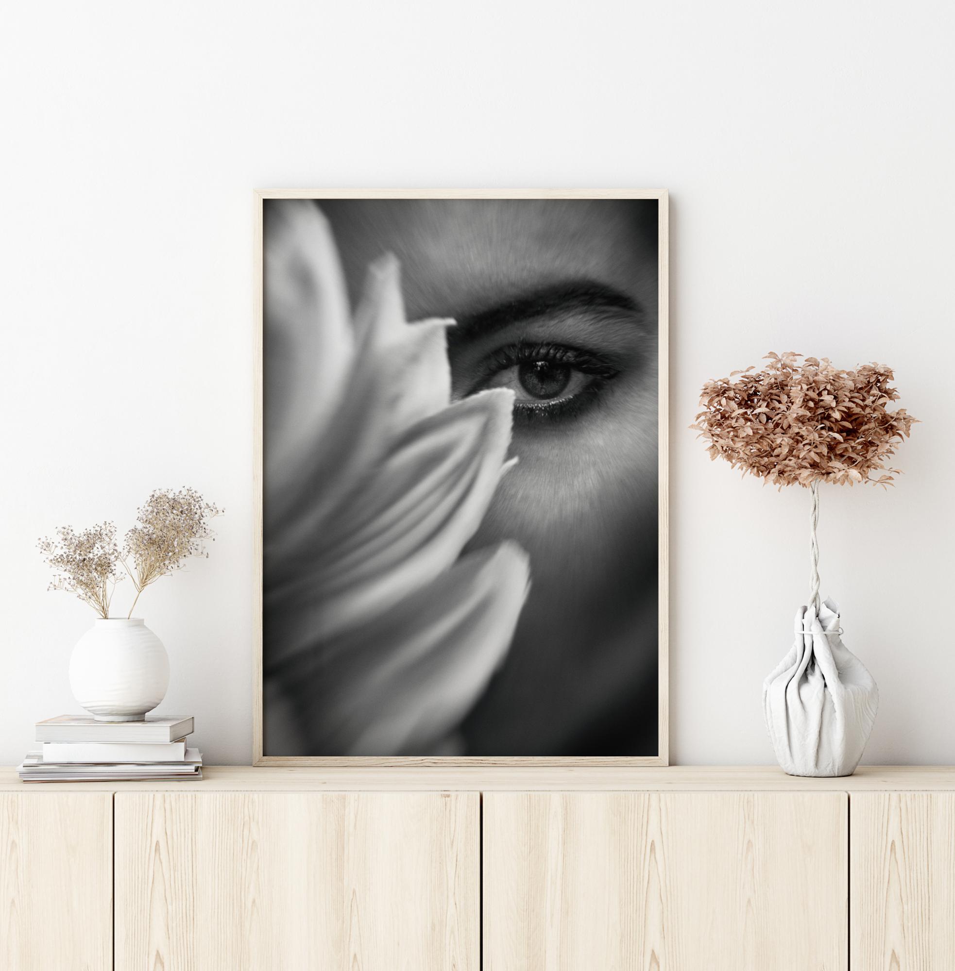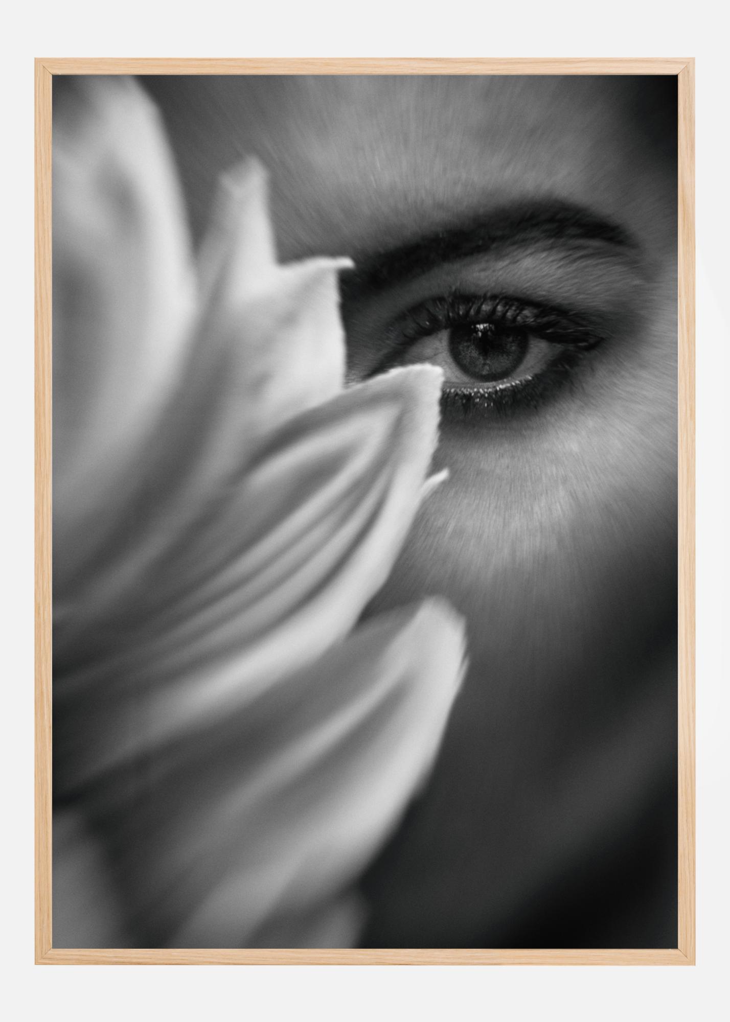 Un poster fantastico con un fiore e un occhio di donna in primo piano. Le tonalità morbide in bianco e nero lo fanno risaltare su tutti i colori. Trasforma qualsiasi stanza in un luogo tranquillo per la contemplazione spirituale.