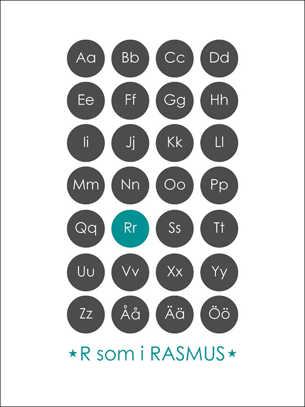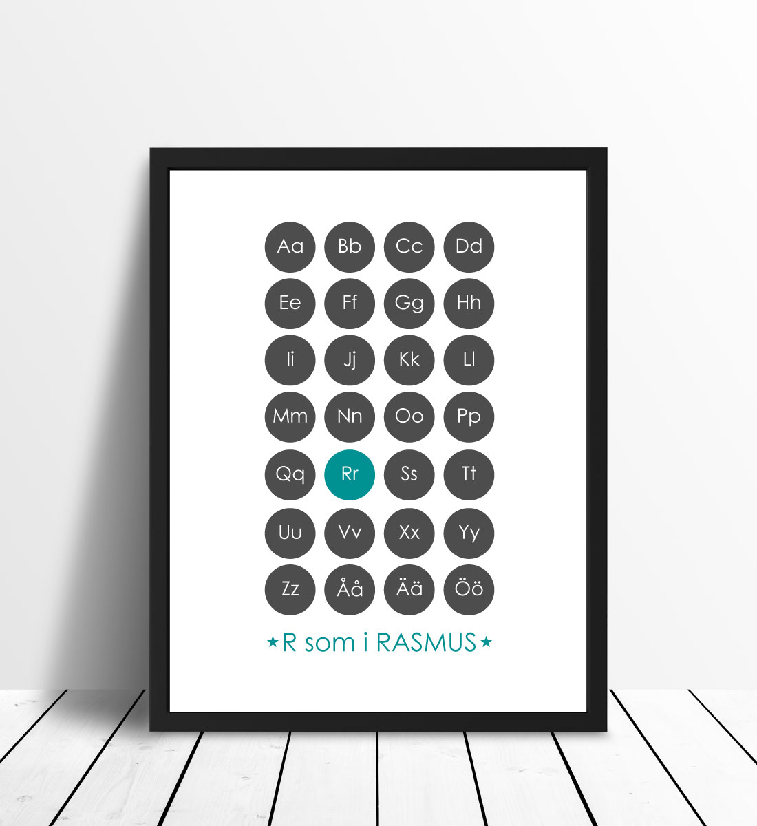 Un poster moderno con l'alfabeto in cui il nome del bambino o della persona e la prima lettera vengono scritti nel colore turchese. Basta inserire il nome della tua persona preferita e il poster verrà stampato con la lettera dell'alfabeto colorata in turchese e il nome aggiunto sotto come nella foto, con la prima lettera maiuscola, seguita da "come in" e poi il nome in maiuscolo.