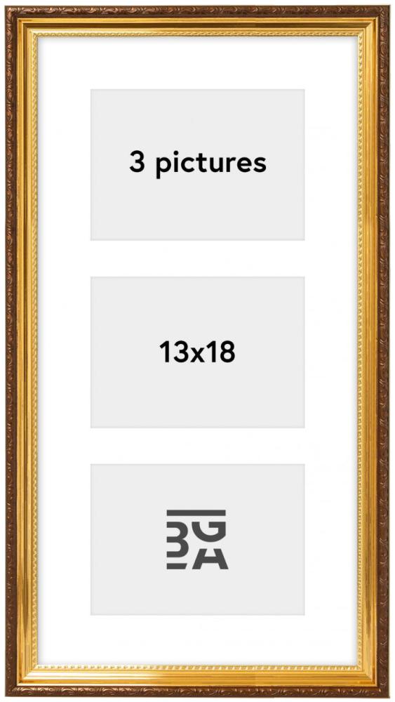 Con questa cornice multipla puoi decorare il tuo muro con foto della famiglia, amici e ricordi fotografici di momenti meravigliosi nella vita. La cornice ha spazio per 3 foto di dimensioni 13x18 cm. La cornice dorata ha uno splendido stile retrò con una decorativa cornice esterna in una calda tonalità marrone. Supporto da parete incluso.