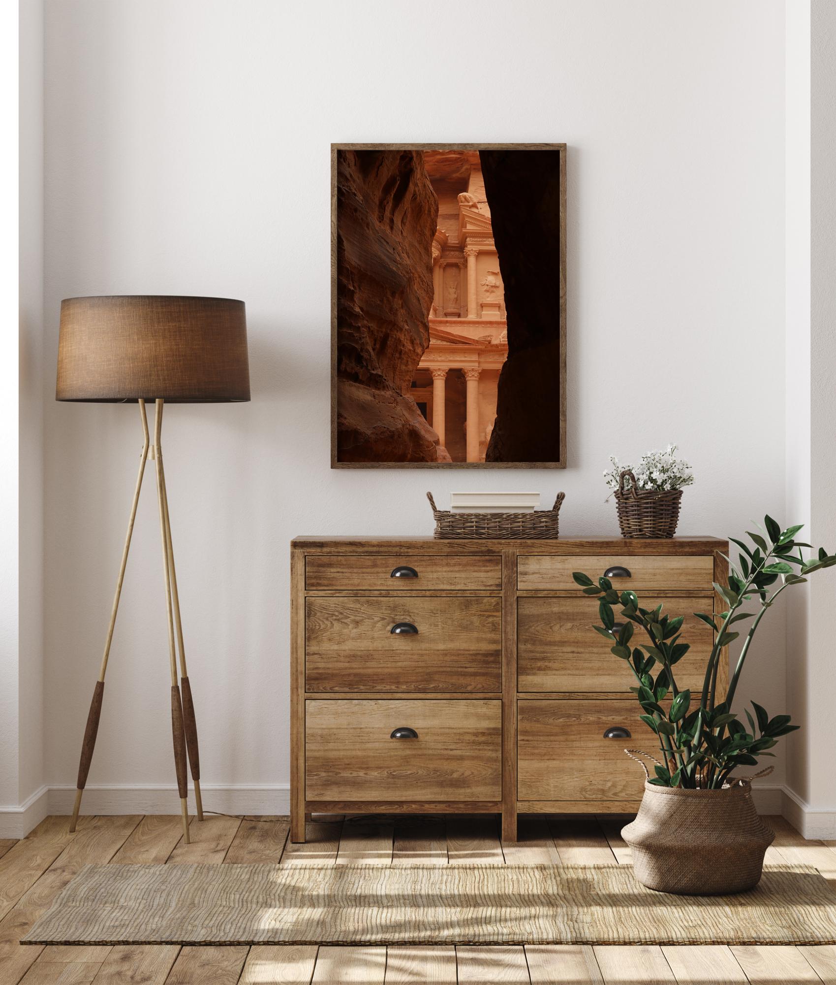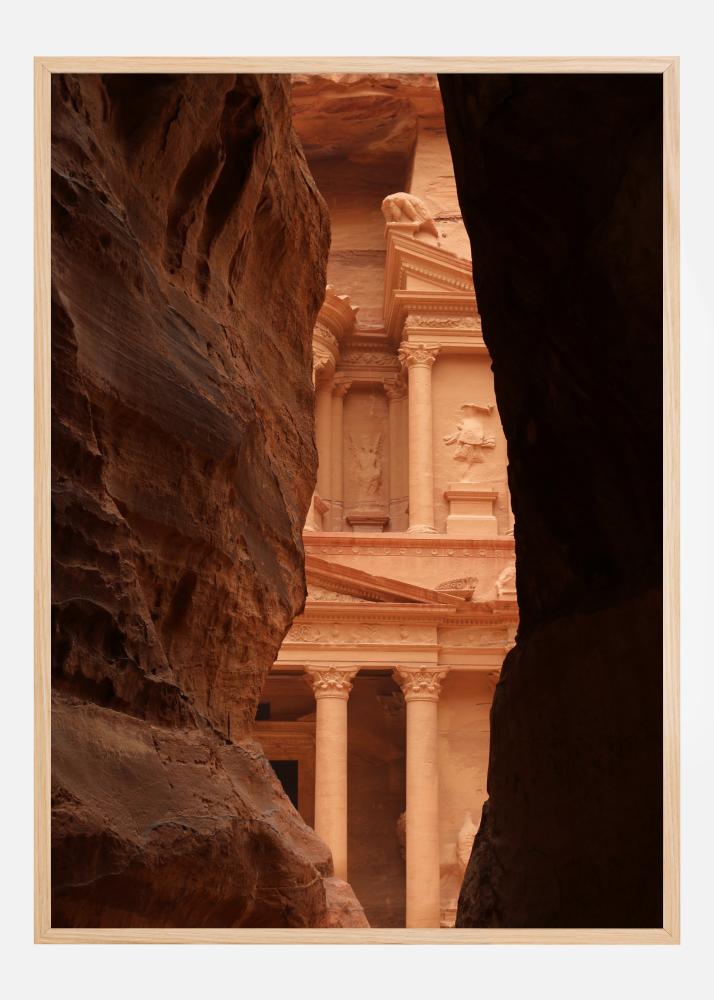 Un poster iconico di un angolo di Petra in Giordania. Guarda una parte della facciata attraverso le rocce rosse di questa meraviglia antica. Appendilo a casa e parti per un viaggio senza lasciare la tua abitazione, esplorando l'antica architettura di questo luogo famoso.