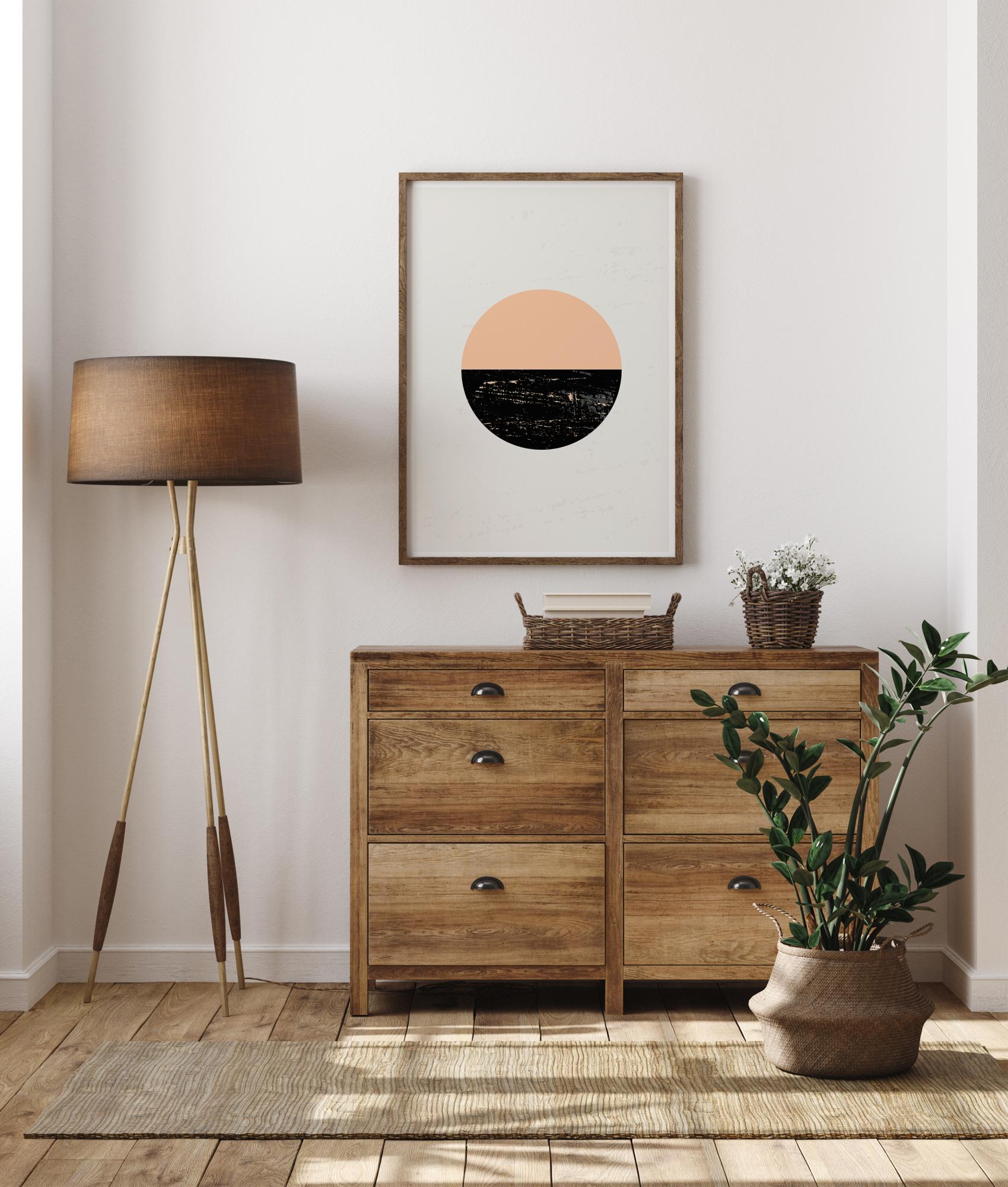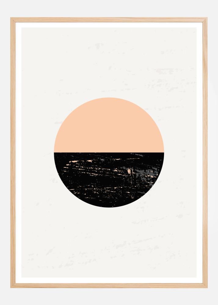 Un poster minimalista con un cerchio in due colori diversi. Il cerchio è su uno sfondo bianco con la metà superiore in una tonalità morbida di pesca che tende al rosa. La metà inferiore è nera con un paesaggio urbano notturno, dove le luci lampeggiano nel buio. Con questa immagine a casa, avrai una buona base per le discussioni.