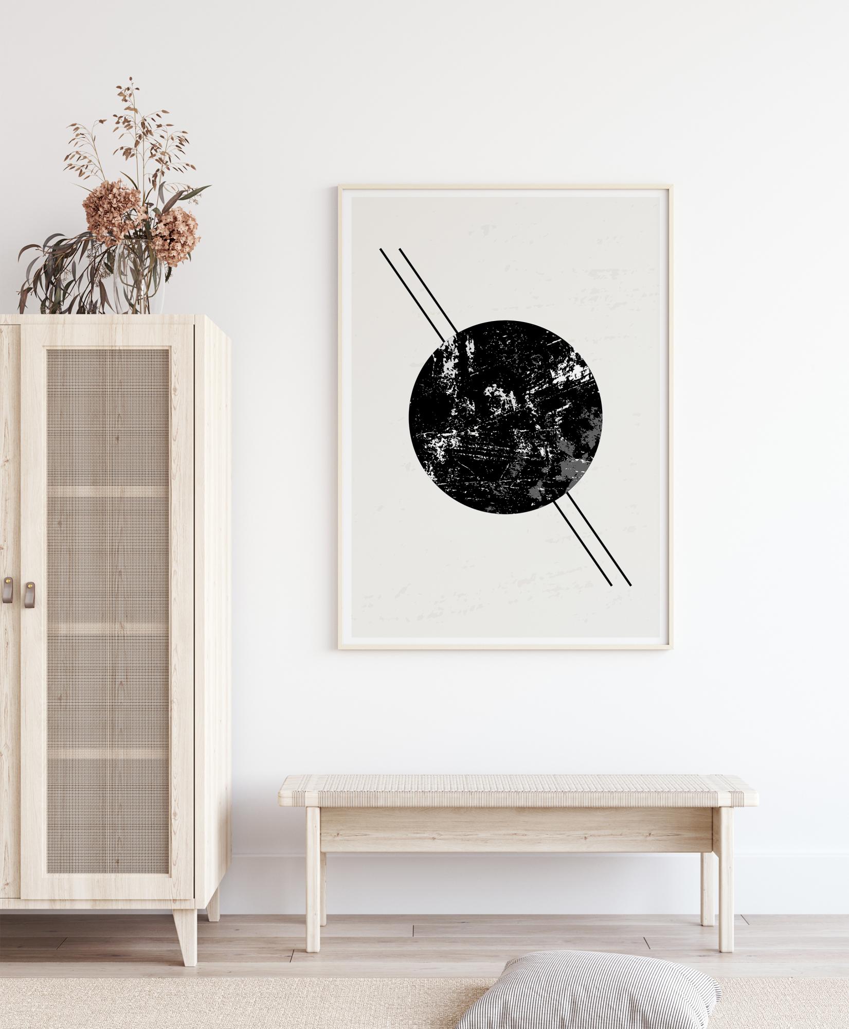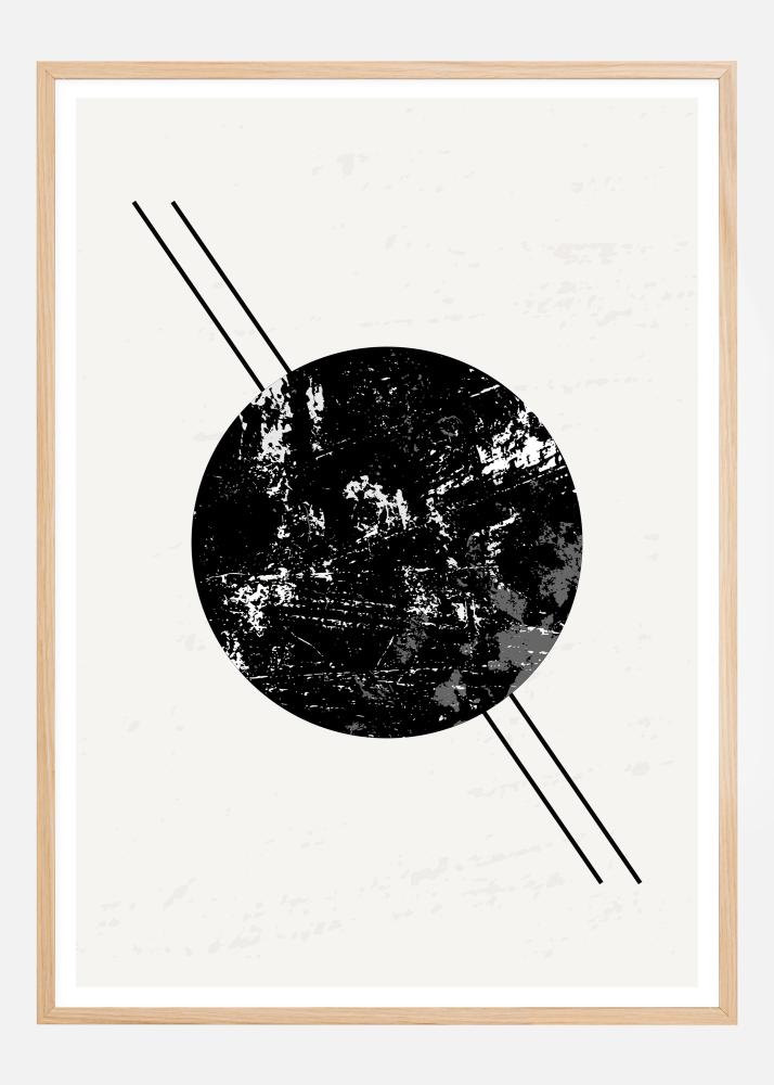 Un poster astratto e potente con un cerchio nero con due linee che vanno dall'angolo superiore sinistro all'angolo inferiore destro. Il cerchio nero ha un effetto marmo bianco e grigio, dove le due linee nere quasi formano gli anelli di Saturno. Porta a casa questo e scopri tutte le possibilità in questa opera d'arte stimolante.