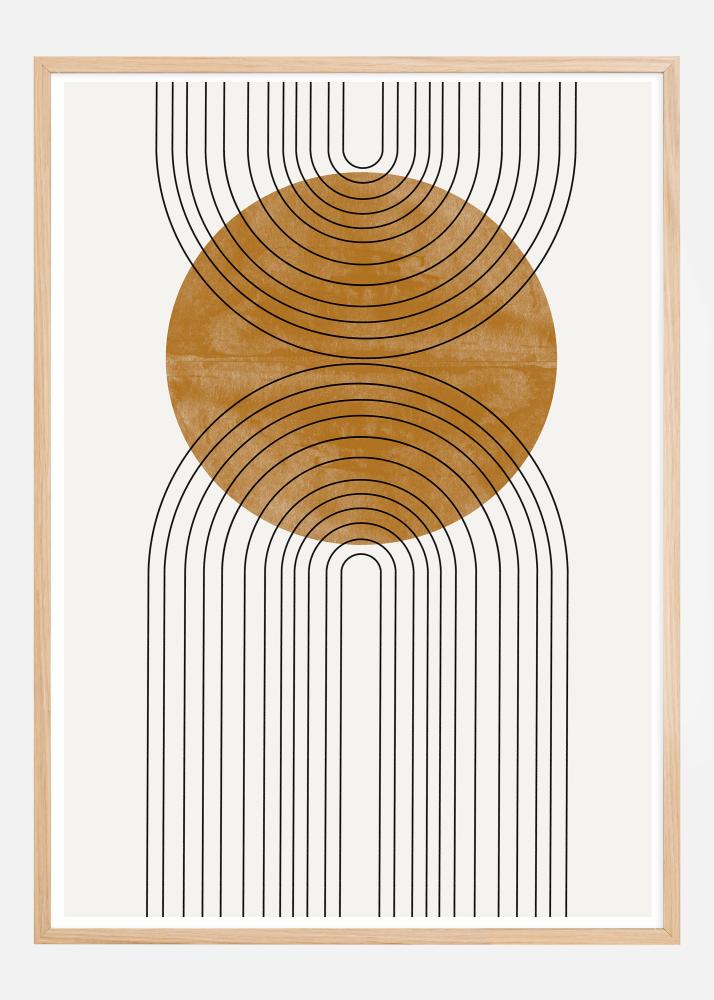 Questo poster cattura un'eccezionale fusione di geometria e natura con le sue linee fluenti che formano due semicerchi sovrapposti. Il design insolito crea un senso di movimento ed equilibrio, mentre le tonalità calde brunastre trasmettono una sensazione di stabilità terrestre. Le sue linee pulite e fluide in nero contrastano magnificamente con lo sfondo chiaro e il colore bruno saturo, creando un'immagine sia moderna che senza tempo.