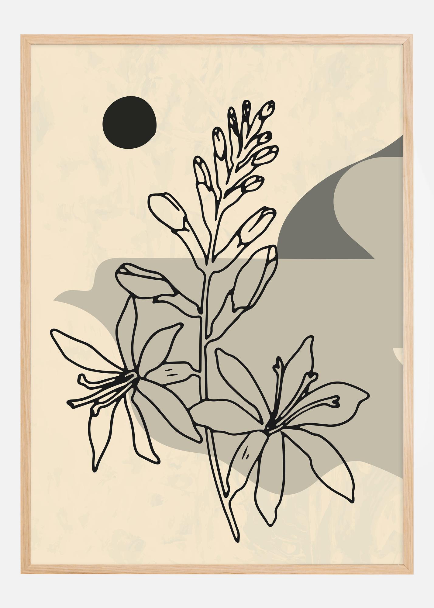 Questo poster esteticamente accattivante cattura un'interpretazione astratta dei fiori in fiore, dove linee grafiche incontrano forme organiche. L'opera gioca su uno sfondo neutro in beige, completato da una forma circolare scura che apporta contrasto e profondità. In primo piano, i fiori e i boccioli stilizzati si estendono verso l'alto in silhouette, creati con contorni neri nitidi che offrono un forte effetto visivo.