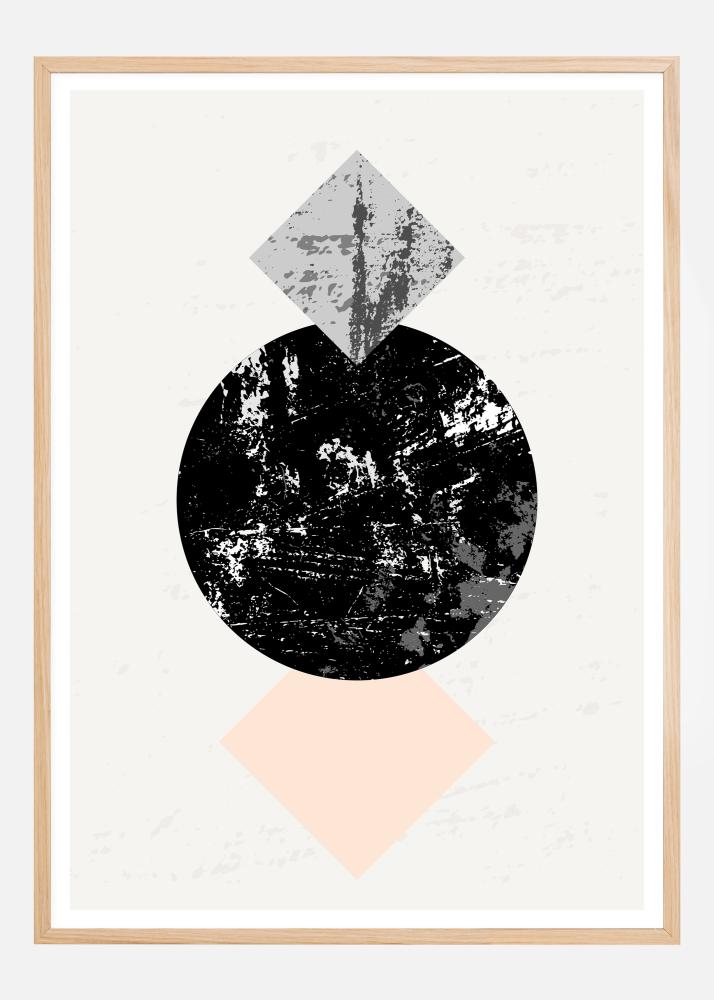 Un poster geometrico astratto con due quadrati che circondano un cerchio. Il cerchio nero ha una venatura di marmo bianco ed è affiancato da un quadrato marmoreo blu e un quadrato rosa. Ogni elemento è posizionato in un punto che focalizza l'occhio sul cerchio a forma di terra al centro. Aggiungi drammaticità a una semplice parete con questa opera d'arte dichiarativa.