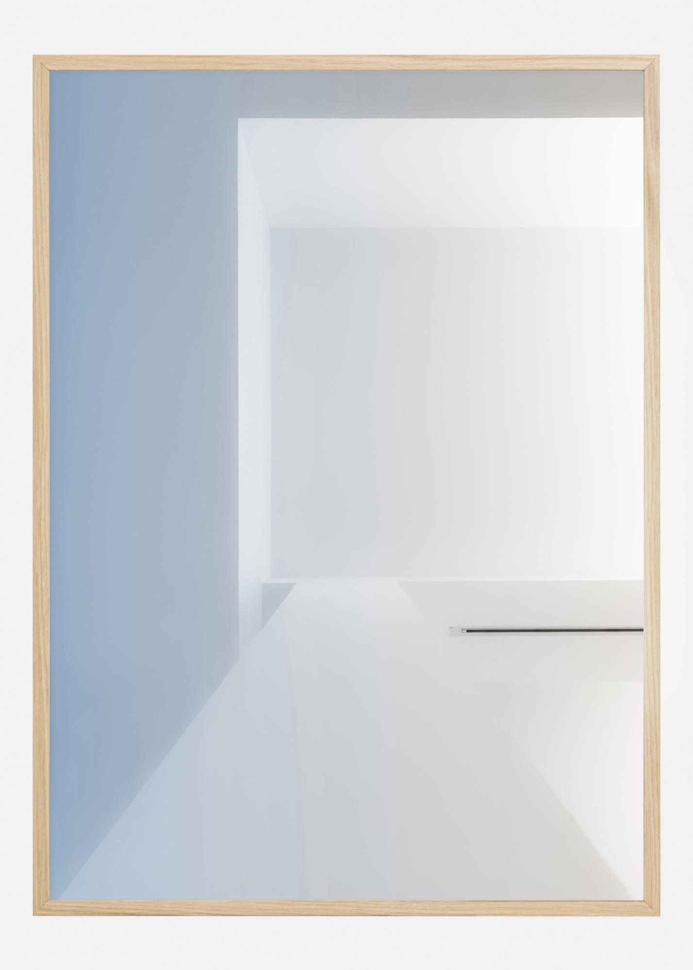 Un poster astratto per l'arredamento con colori rilassanti di blu e bianco. Lo sfondo principale è di un blu morbido con un quadrato bianco che sembra una finestra e un piano di lavoro. Un'esplosione di bianco delicatamente abbagliante sulla destra sembra il sole che irrompe per un tocco di tranquillità nella tua casa.