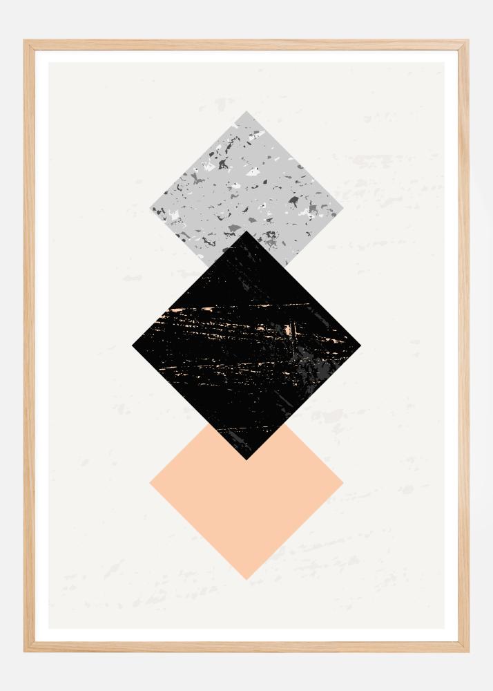 Un poster geometrico con tre quadrati di diversi colori. Un'immagine più morbida in cui l'attenzione è focalizzata su un quadrato nero, ma viene ammorbidita a sua volta da un quadrato blu sopra e un quadrato rosa sotto, entrambi con ulteriori motivi. Aggiungi un po' di drammaticità, senza essere travolgente, quando appendi questo poster nell'ingresso o in una stanza con luce naturale.