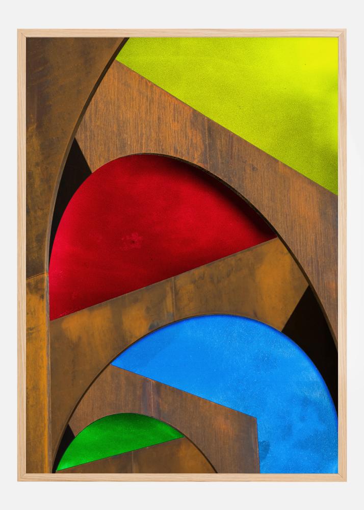Un poster astratto luminoso con forme colorate. I colori primari riempiono quest'opera con semicerchi rossi, gialli e blu. Queste forme sono unite da tagli di legno dritti su uno sfondo nero. Dà vita a una parete noiosa e liscia o abbinala a un altro colore audace esistente per completare l'opera.