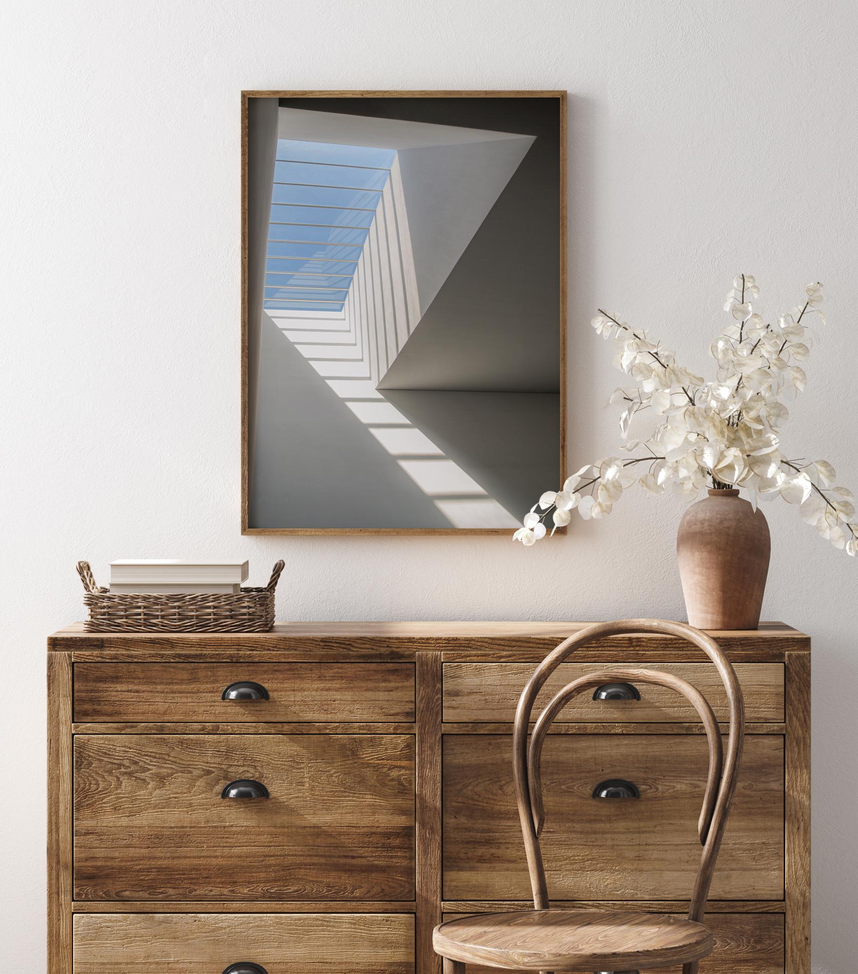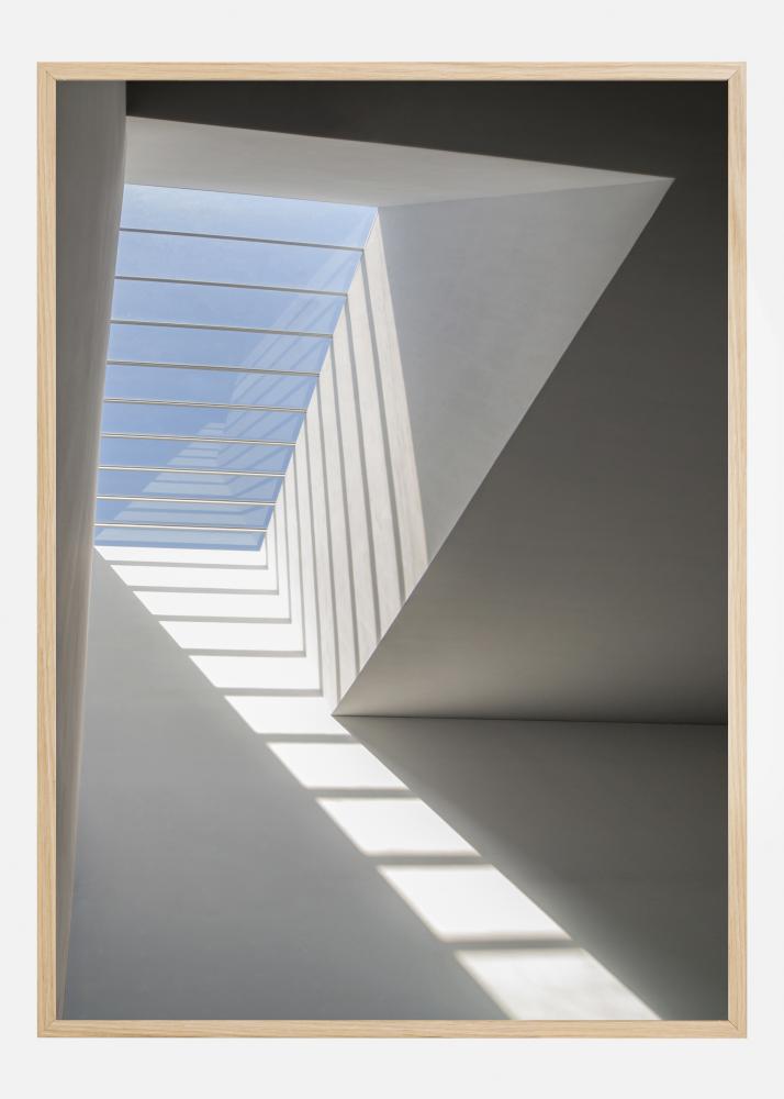Un poster semplice e arioso in una stanza bianca luminosa. A sinistra c'è un abbaino con un cielo blu. La luce che filtra crea ombre che sembrano una scala che guida l'occhio verso la luce esterna. Porta luminosità in una stanza buia con l'aiuto di questa immagine tranquilla.
