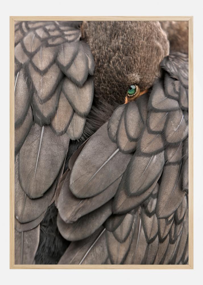 Questo affascinante poster cattura il momento di intimità nella natura attraverso il primo piano di un uccello, dove il suo luminoso occhio verde brilla come uno smeraldo incastonato tra le sfumature grigie delle piume. Ogni piuma è scolpita con precisione, evocando un senso della forma e della struttura elegante dell'uccello. È un'opera che parla sia agli amanti degli uccelli che agli artisti, e a coloro che apprezzano la bellezza sottile della natura.