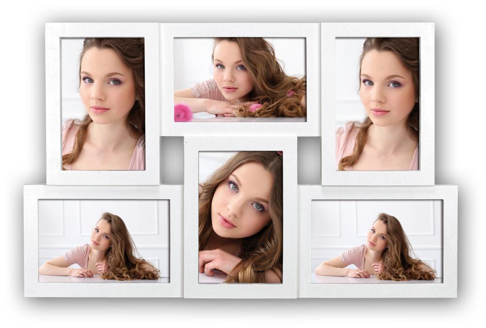 Moderno cornice bianca multi-foto con spazio per 6 immagini sia in formato orizzontale che verticale. Perfetto quando si desidera creare un Cornice Multifoto personalizzato da appendere al muro.