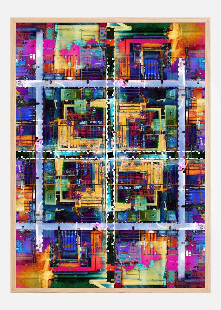 Un poster al neon pieno di modelli astratti. Come uno spettro di colori simile a una macchia di petrolio, questa immagine assomiglia a una sezione trasversale di diverse stanze. Ogni quadrato è riempito di una miriade di colori che rendono questa opera affascinante da guardare per ore - si adatta meglio se posizionata su una parete neutra.