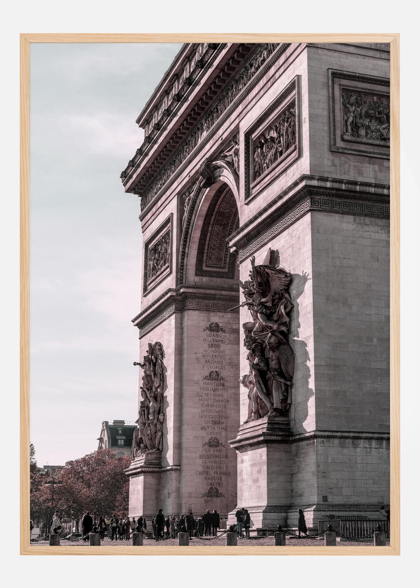 Questo elegante poster mette in risalto l'architettura maestosa e dettagliata dell'Arco di Trionfo a Parigi. In questa stampa unica viene catturata la grandezza e la ricchezza di dettagli del celebre monumento, dalle imponenti sculture che adornano le sue colonne alle raffinate decorazioni e iscrizioni che raccontano la sua importanza storica. Con una leggera tonalità rosa che crea un'atmosfera calda, questa immagine è un omaggio alla storia e all'architettura francese, e diventa un'aggiunta colta a qualsiasi collezione di arte e poster.