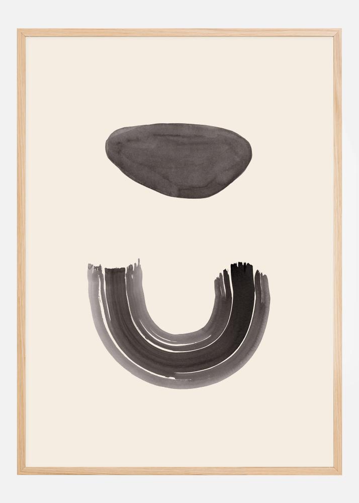 Un elegante poster astratto con un arco e una roccia. La roccia è sospesa al centro di uno sfondo bianco, l'arco rovesciato appena sotto fa sembrare un volto sorridente. C'è una calamita sotto la roccia? Incoraggia interpretazioni libere una volta che hai appeso questa opera in casa.