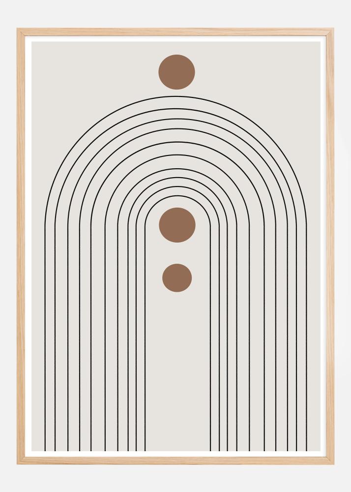 Questo poster grafico raffigura un motivo ad arco stilizzato, che evoca la sensazione di un'architettura monumentale in forma semplificata. Le linee nere formano un motivo a semicerchio che crea un'illusione di dimensione e profondità, mentre i cerchi marroni inseriti apportano un elemento di contrasto organico alla geometria altrimenti rigorosa. Questa opera astratta è sia rigorosa che giocosa, con un equilibrio armonioso tra curve ed elementi lineari.
