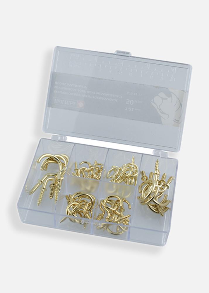 Questo assortimento di ganci contiene 50 ganci placcati in ottone di dimensioni comprese tra 7–21 mm. Perfetto per diversi tipi di appendimenti in casa, sia per quadri, decorazioni o altri piccoli dettagli. Un set pratico per chi desidera una soluzione di montaggio elegante e funzionale.
