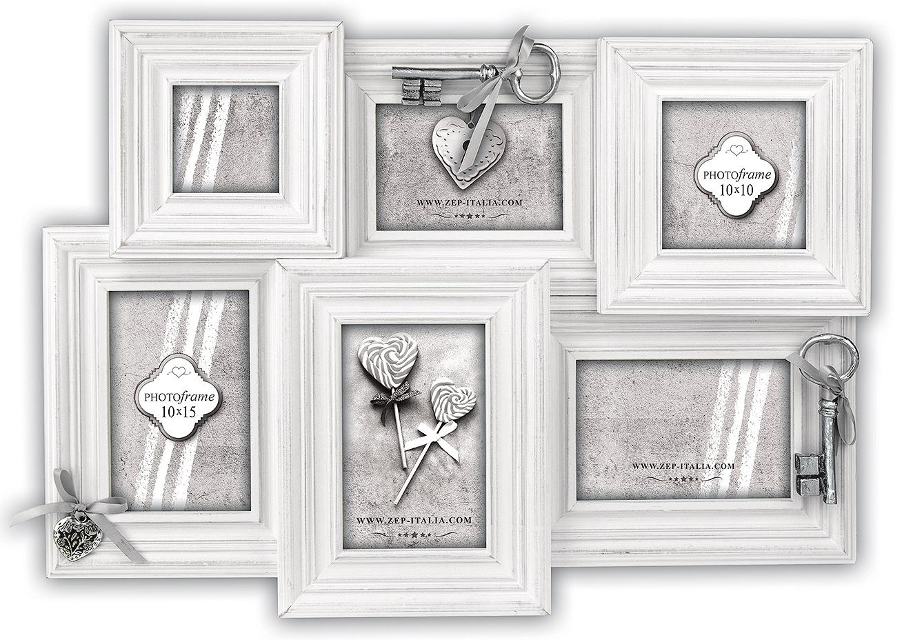 Stampa le tue foto preferite e incorniciale in questa cornice multipla rustica con dettagli decorativi in argento. questa cornice multipla ha spazio per 6 foto di dimensioni 7x7 cm / 9x13 cm / 10x10 cm / 10x15 cm. La Cornice multipla è realizzata in legno e ha una tonalità bianca. Dimensioni esterne 53x37,5 cm. Supporto da parete incluso.