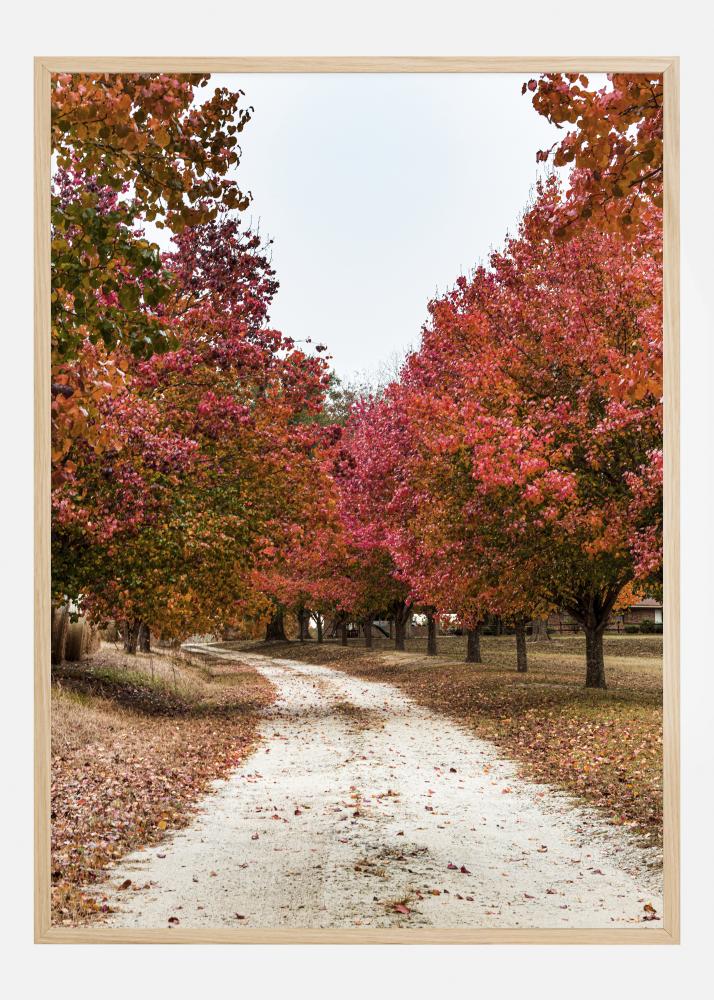 Un poster paesaggistico di un parco autunnale e un vicolo. Una strada bianca di ghiaia taglia attraverso alberi vivaci con foglie rosse. Il cielo azzurro chiaro riflette la strada mentre si curva in lontananza. Rivivi la bellezza dei colori autunnali ogni giorno con questo poster nella tua casa. Puoi appendere questo poster insieme a qualsiasi dipinto.