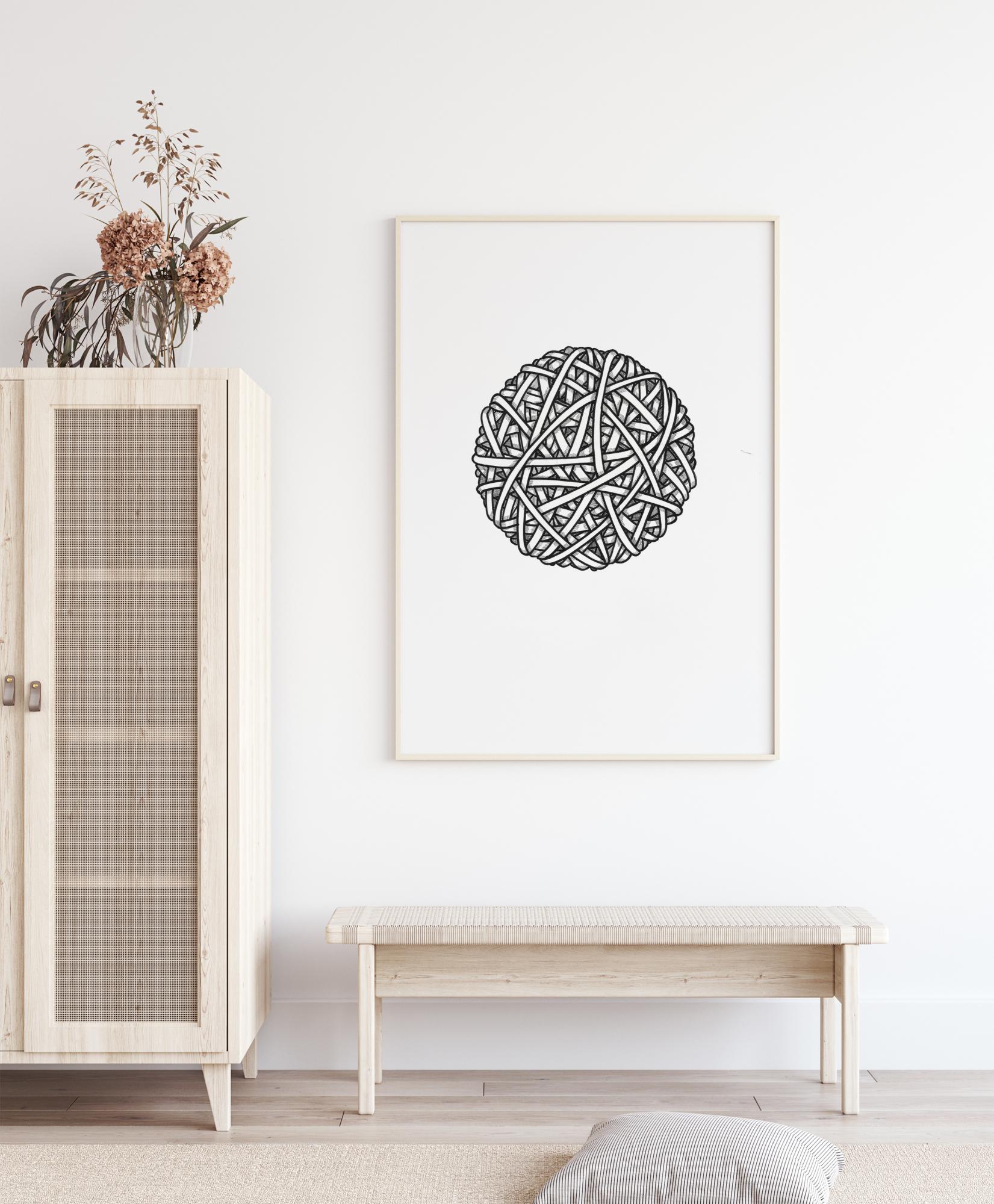 Un poster grafico in bianco e nero su un gomitolo a forma di palla. Un quadro semplice e minimalista che si adatta perfettamente a mescolarsi con altri meravigliosi preferiti in un collage più grande.