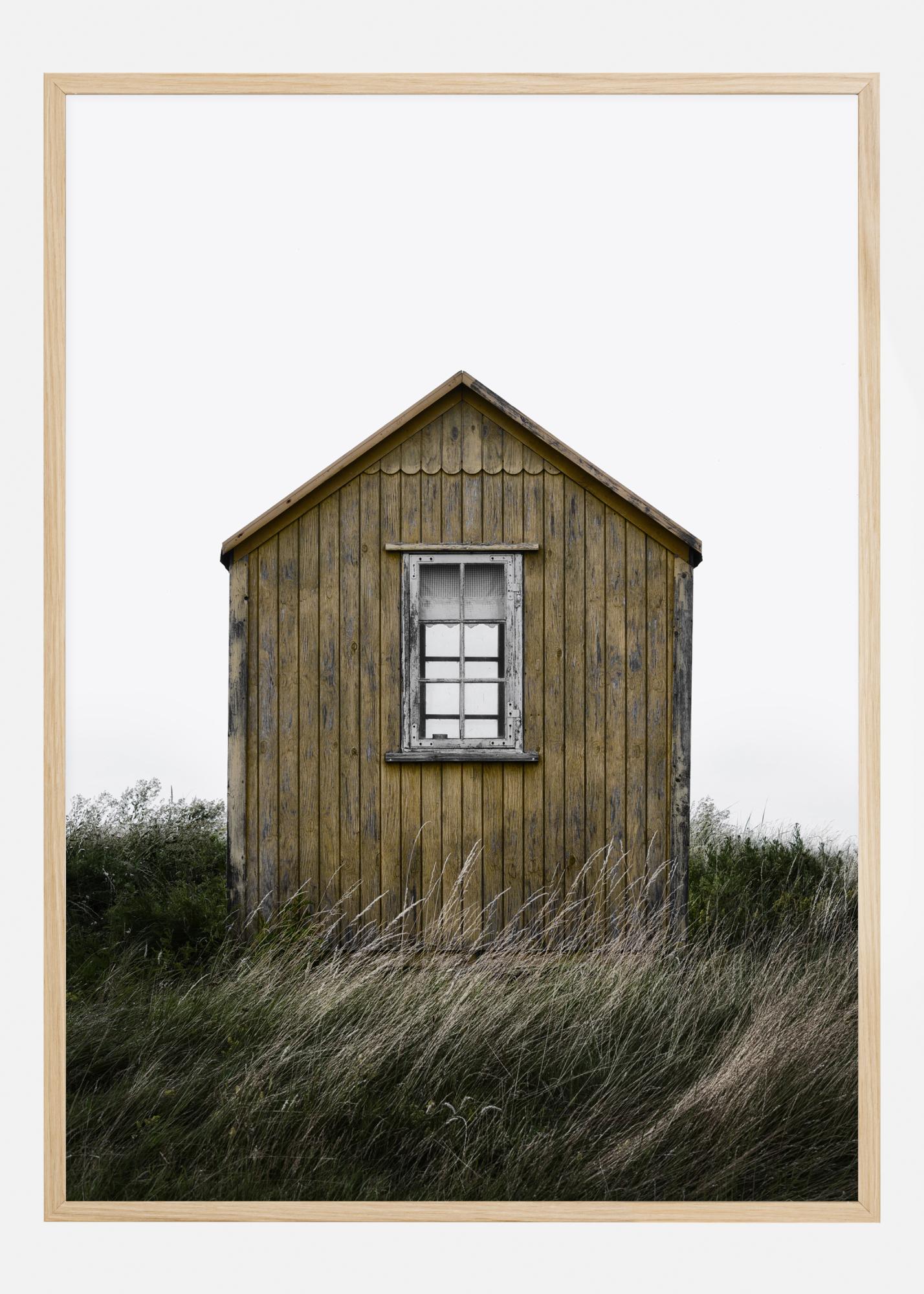 Un'elegante cartolina paesaggistica con una semplice casetta in legno sulla spiaggia. La solitaria casetta si erge su dune di sabbia e erba battute dal vento. Senti quella sensazione di apertura e libertà quando la metti in mostra nella tua casa.