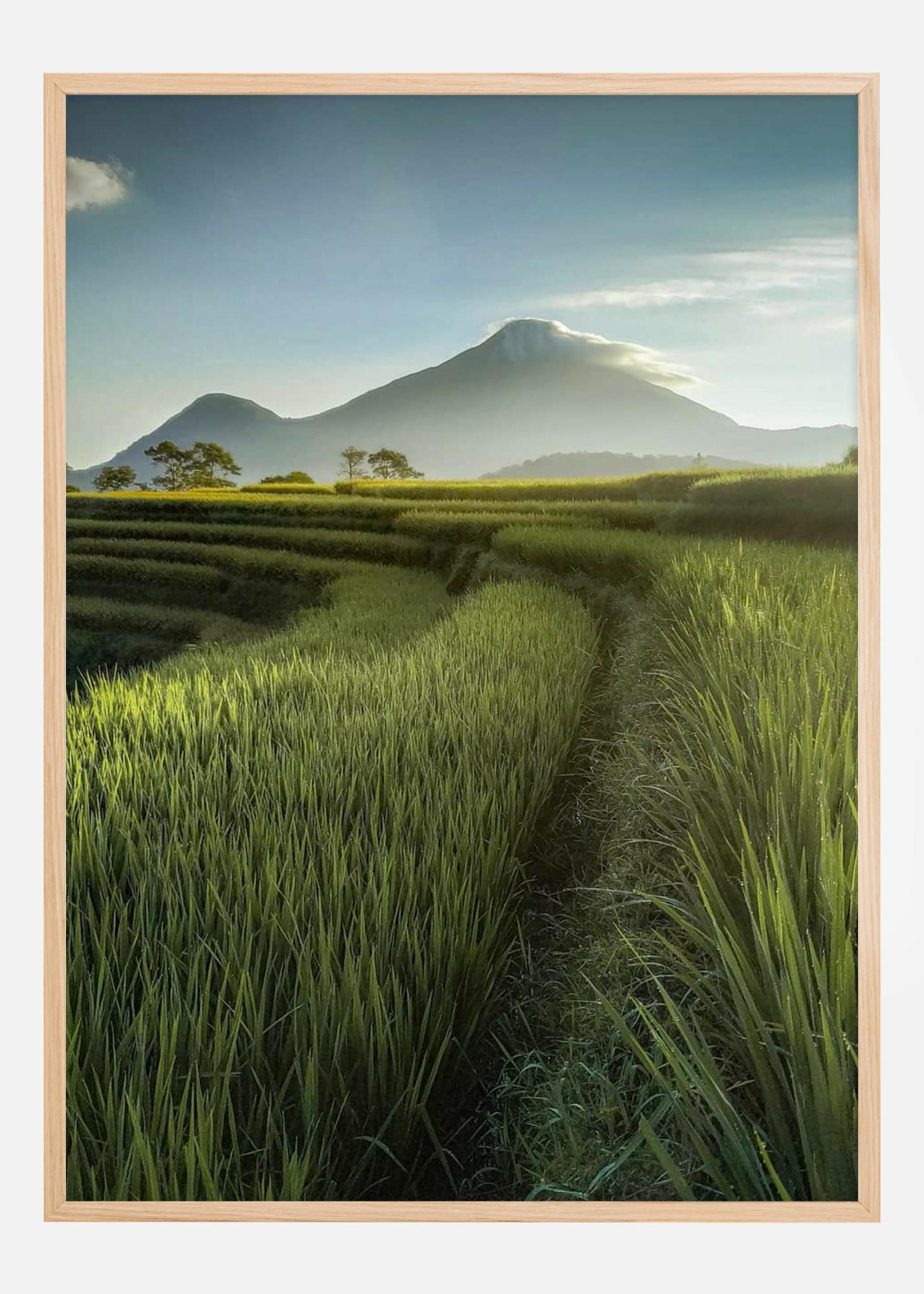 Questo poster offre uno scorcio di un'idilliaca pastorella, dove campi di riso verdi si estendono su uno sfondo di montagne maestose e un cielo morbido. La luce che si diffonde sul paesaggio dona una sensazione calda e accogliente, rendendo questa stampa un modo perfetto per portare un po' di calma e bellezza della natura nella tua casa o sul posto di lavoro.