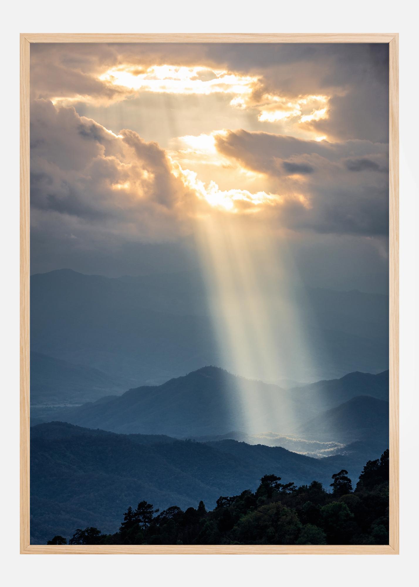 Questo poster ispiratore raffigura un paesaggio maestoso dove i raggi del sole si insinuano tra le nuvole e illuminano le montagne increspate. È una scena che cattura la bellezza sublime della natura, con un cielo drammatico che contrasta con le montagne dai contorni morbidi. Ombre e luci giocano sul paesaggio creando una forte sensazione di profondità e spazio.
