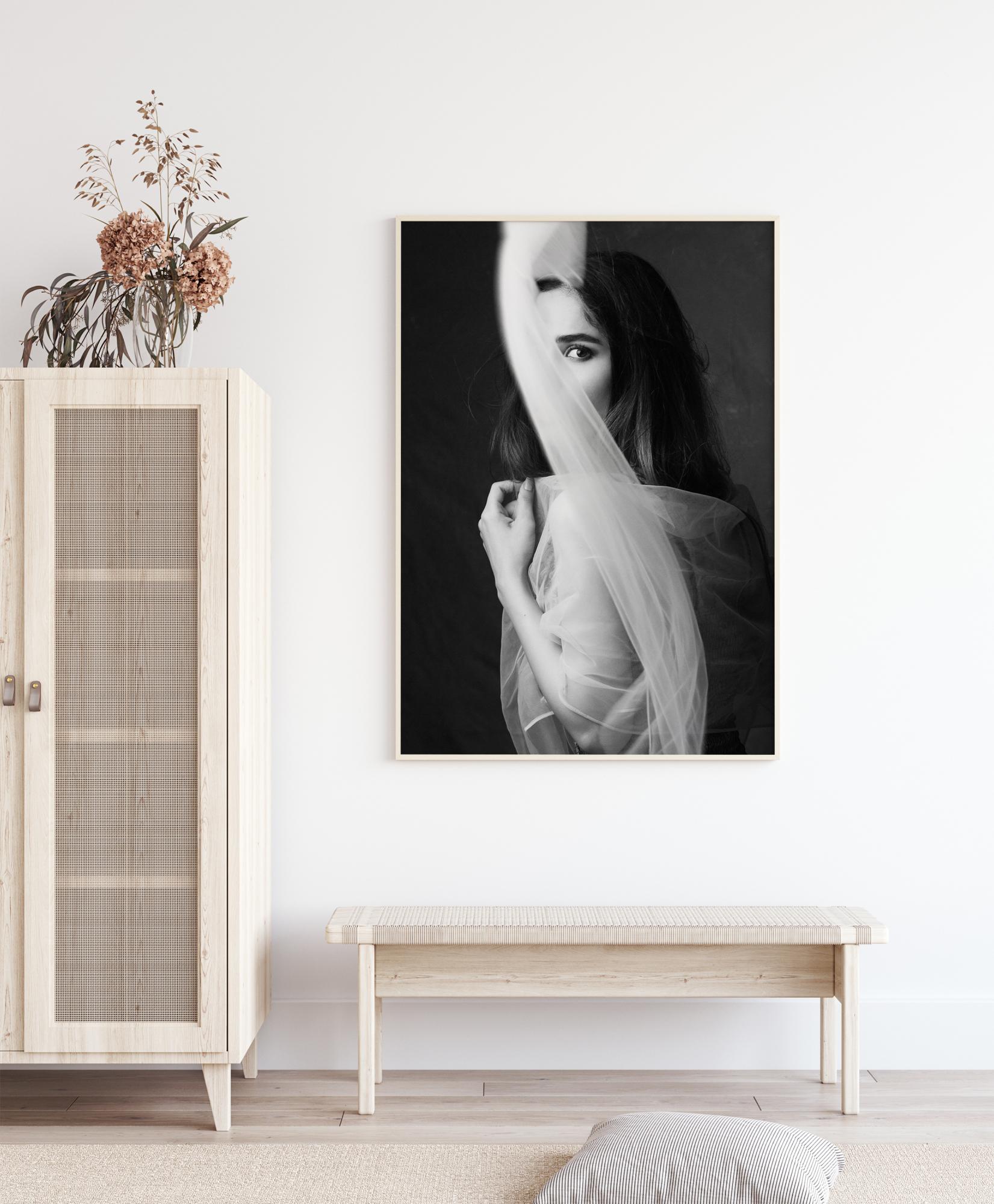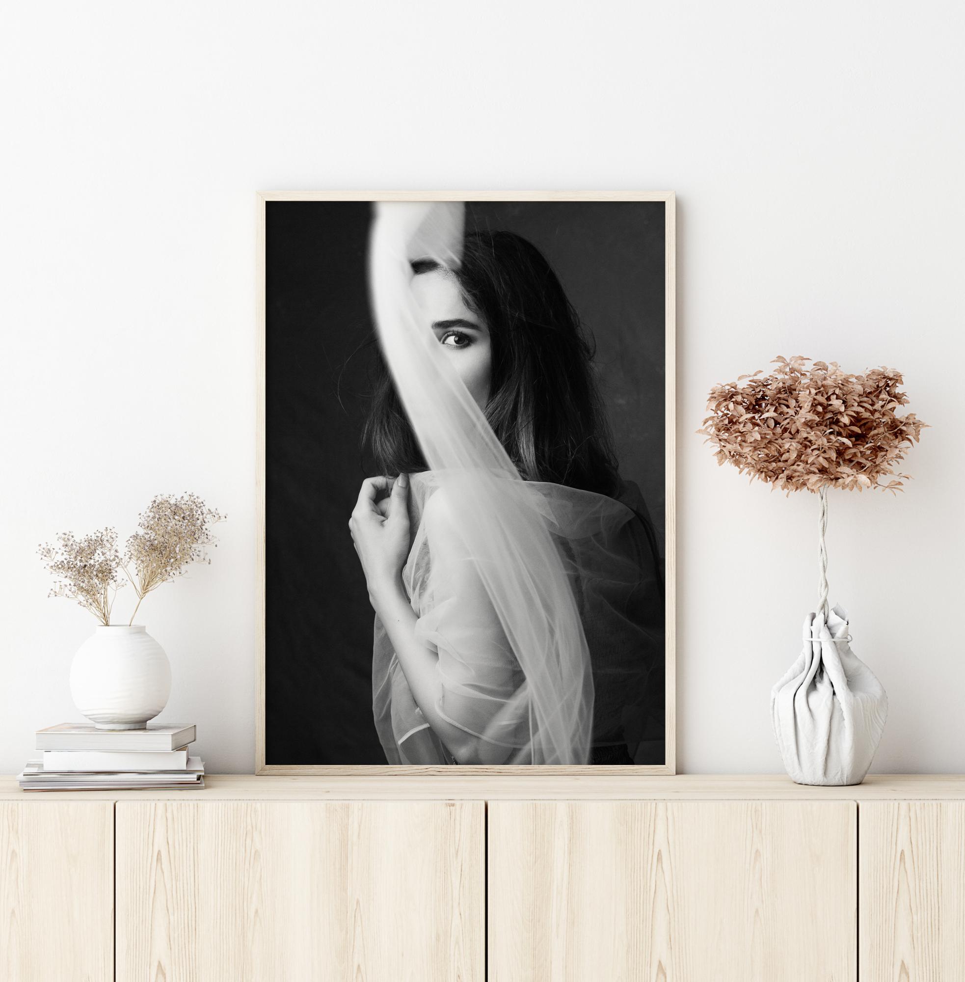 Una foto sensuale di una donna che si nasconde dietro una tenda. Il morbido movimento della tenda attira lo sguardo sul viso della donna. Questo poster ti porta in un luogo tranquillo dove puoi entrare in contatto.