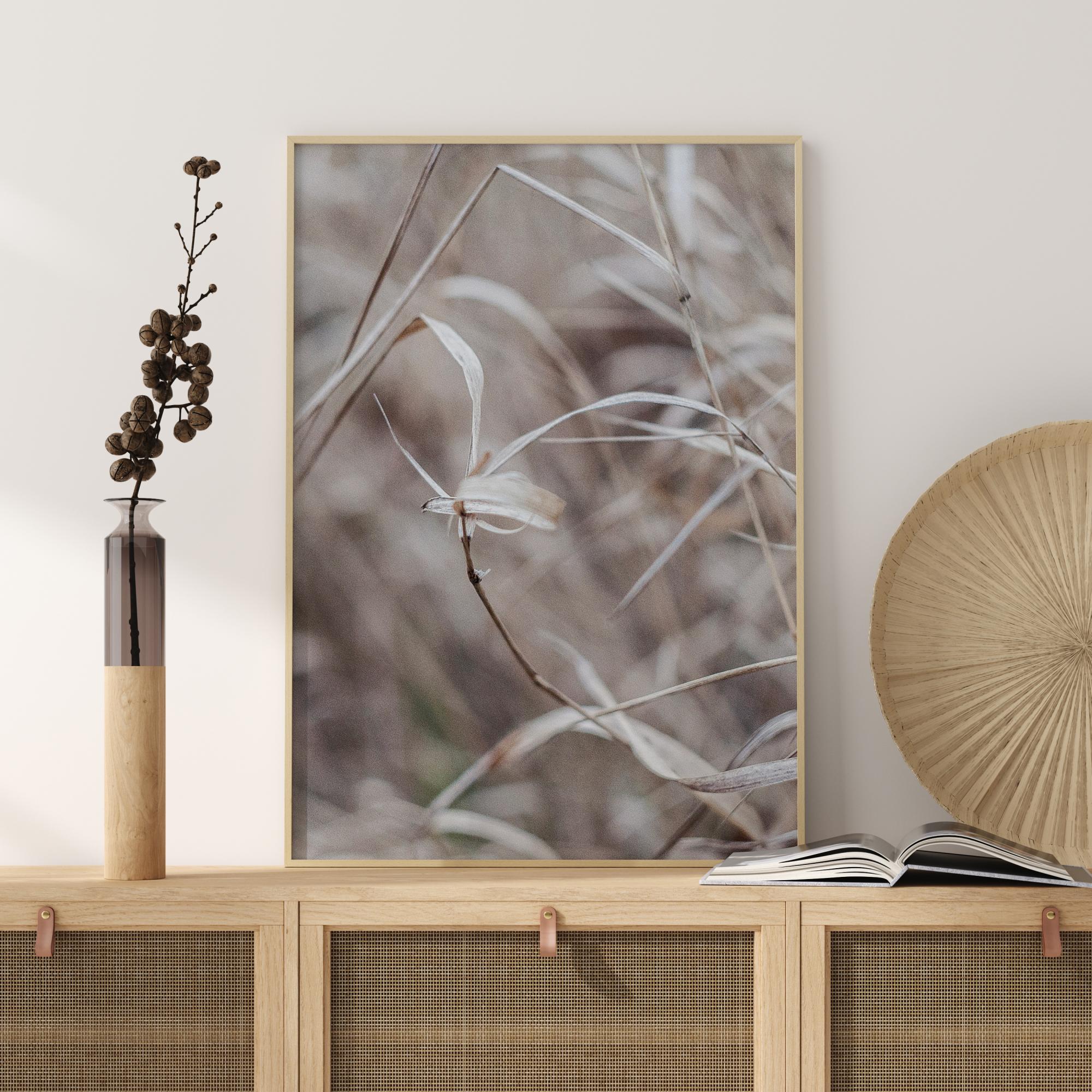 Un elegante poster naturale con foglie morbide in primo piano. I gambi e le foglie morbide conducono lo sguardo intorno all'opera. Una sensazione di profondità si crea grazie allo sfondo sfocato. Appendi questa immagine su una parete di colore chiaro per far risaltare i morbidi colori pastello neutri.