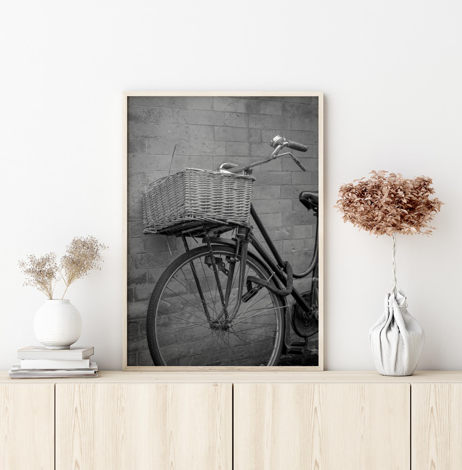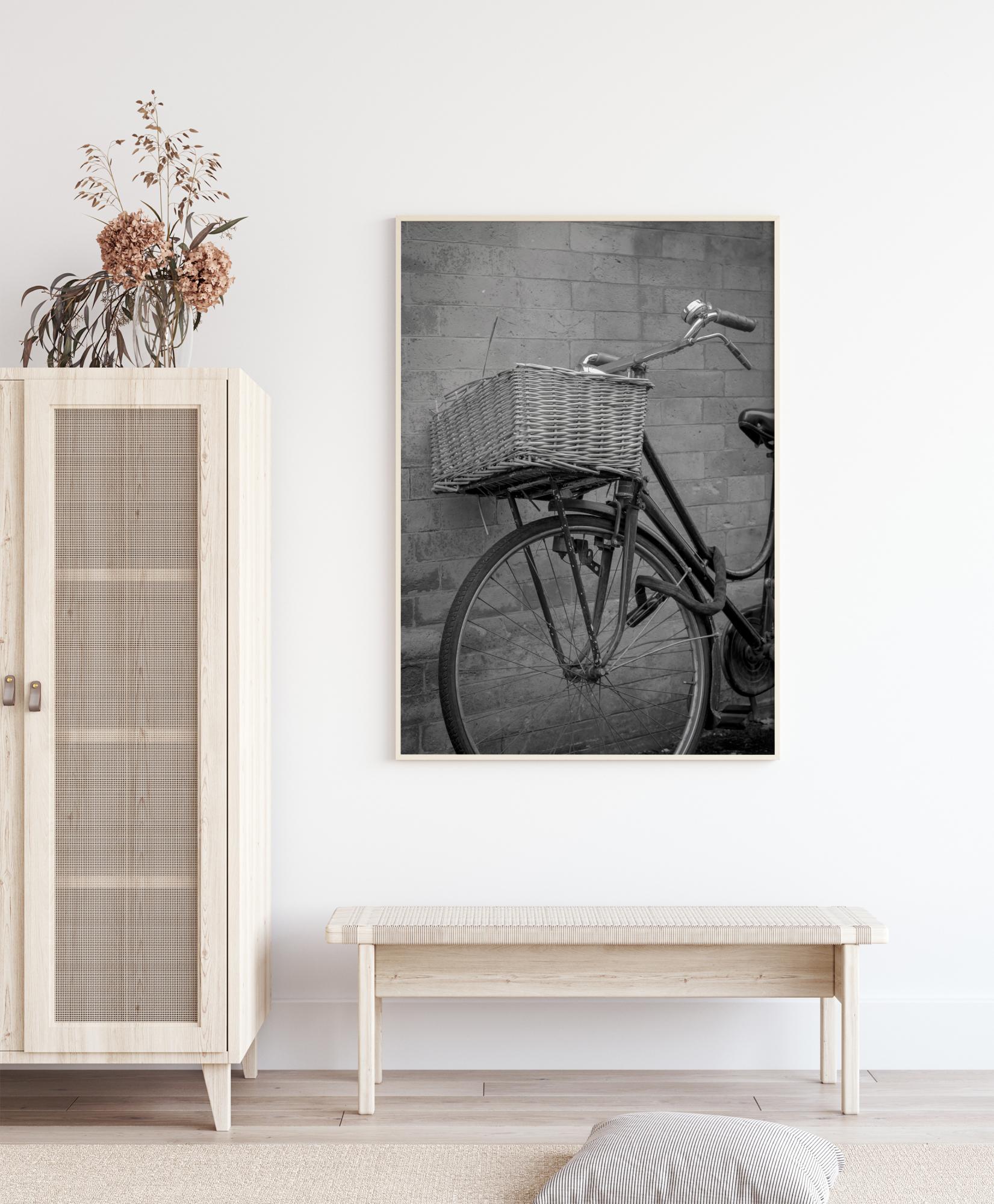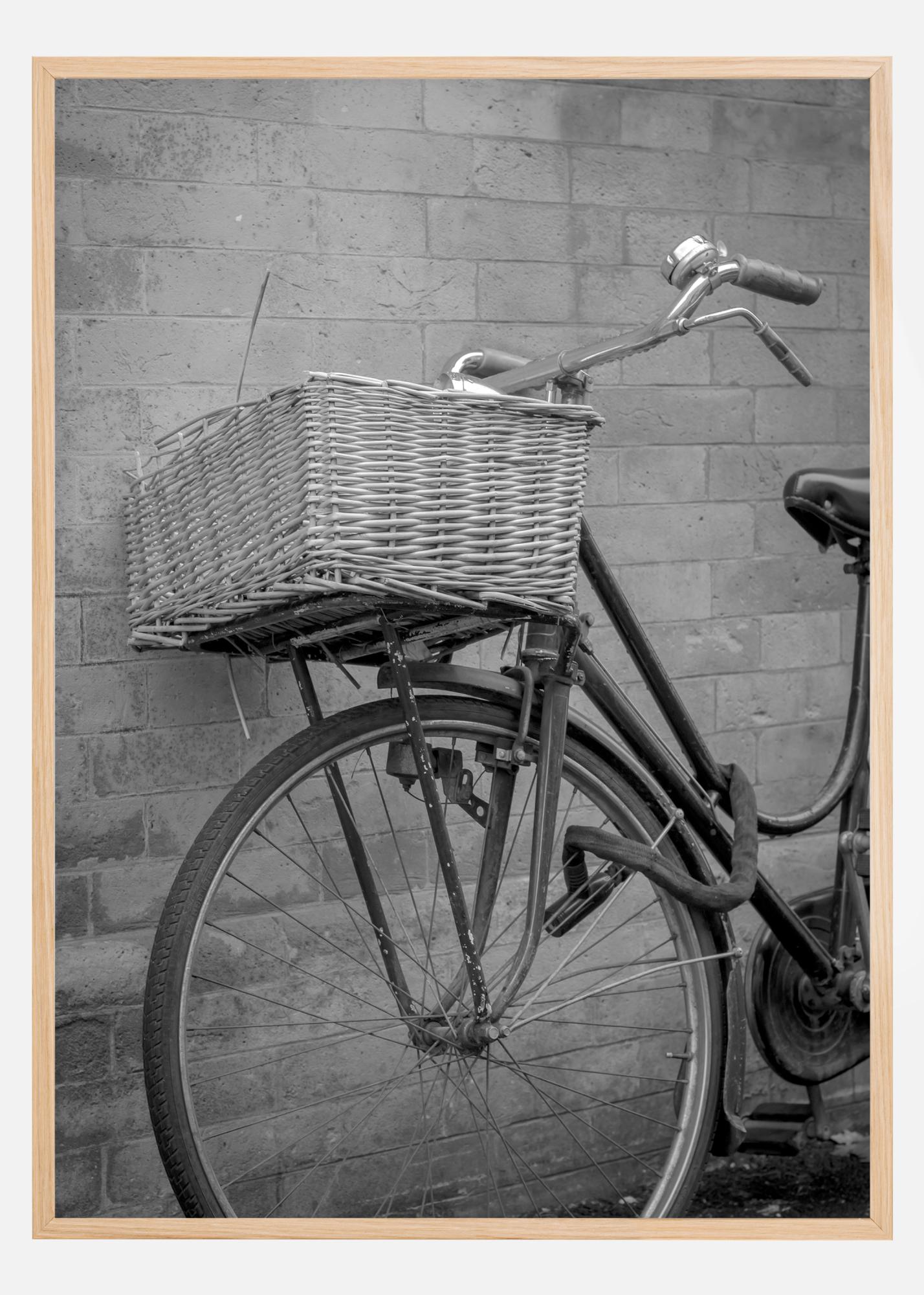 Un poster di natura morta con una bicicletta appoggiata a un muro di mattoni. Il cesto della bicicletta è al centro dell'attenzione e la cornice nera contrastante e la serratura della bicicletta guidano lo sguardo intorno al poster. Appendi questa immagine semplice ma elegante su una parete chiara per un effetto di buon gusto.