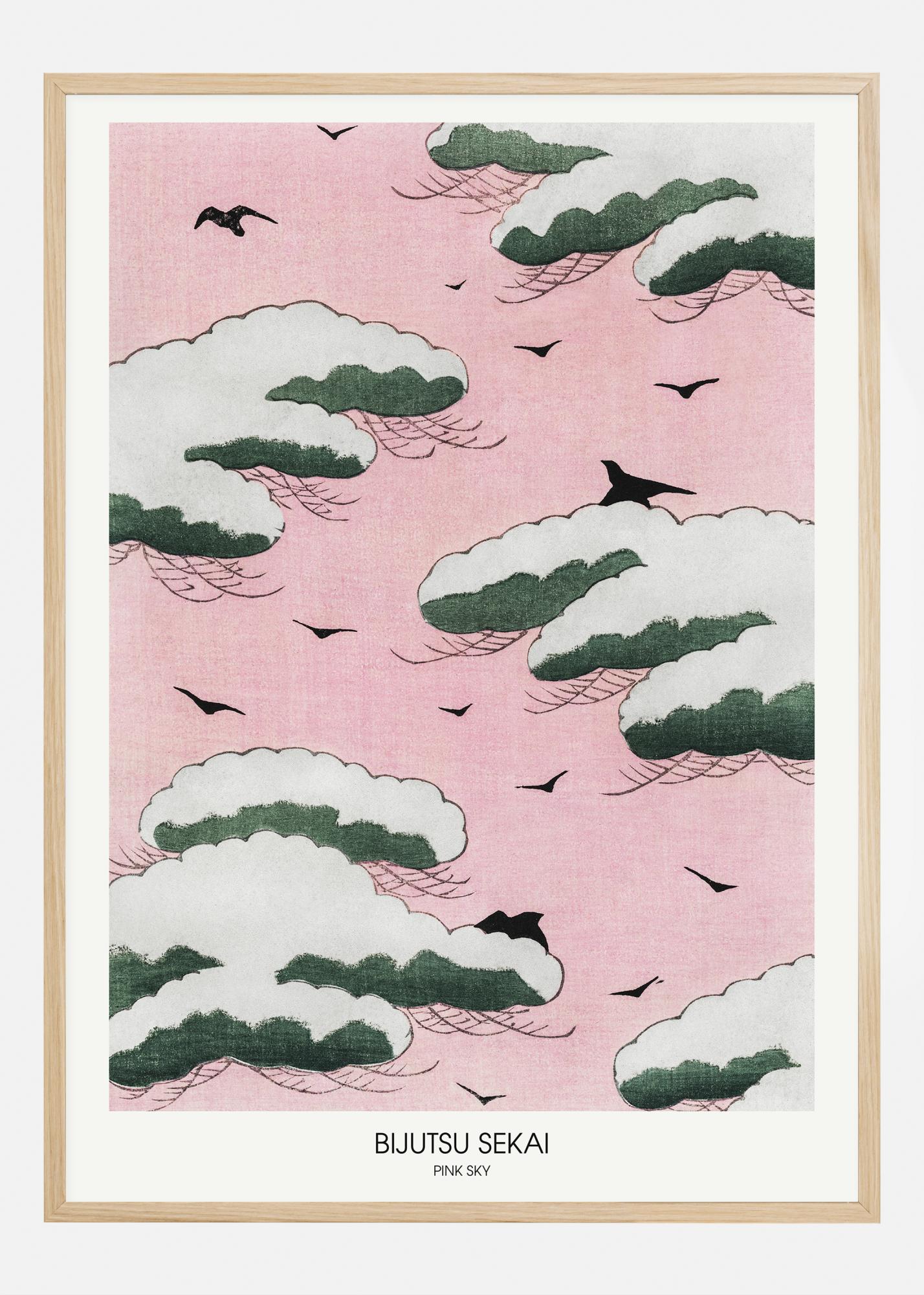 Questo poster calmante e poetico intitolato "Bijutsu Sekai Pink Sky" cattura l'essenza di un mattino o una sera tranquilla con il suo morbido cielo rosa come sfondo per eleganti nuvole fluttuanti e sagome di uccelli in volo. Questa stampa è un'oasi di pace e sarebbe perfetta in una camera da letto o uno spazio di meditazione, dove può donare una sensazione di tranquillità e riflessione.
