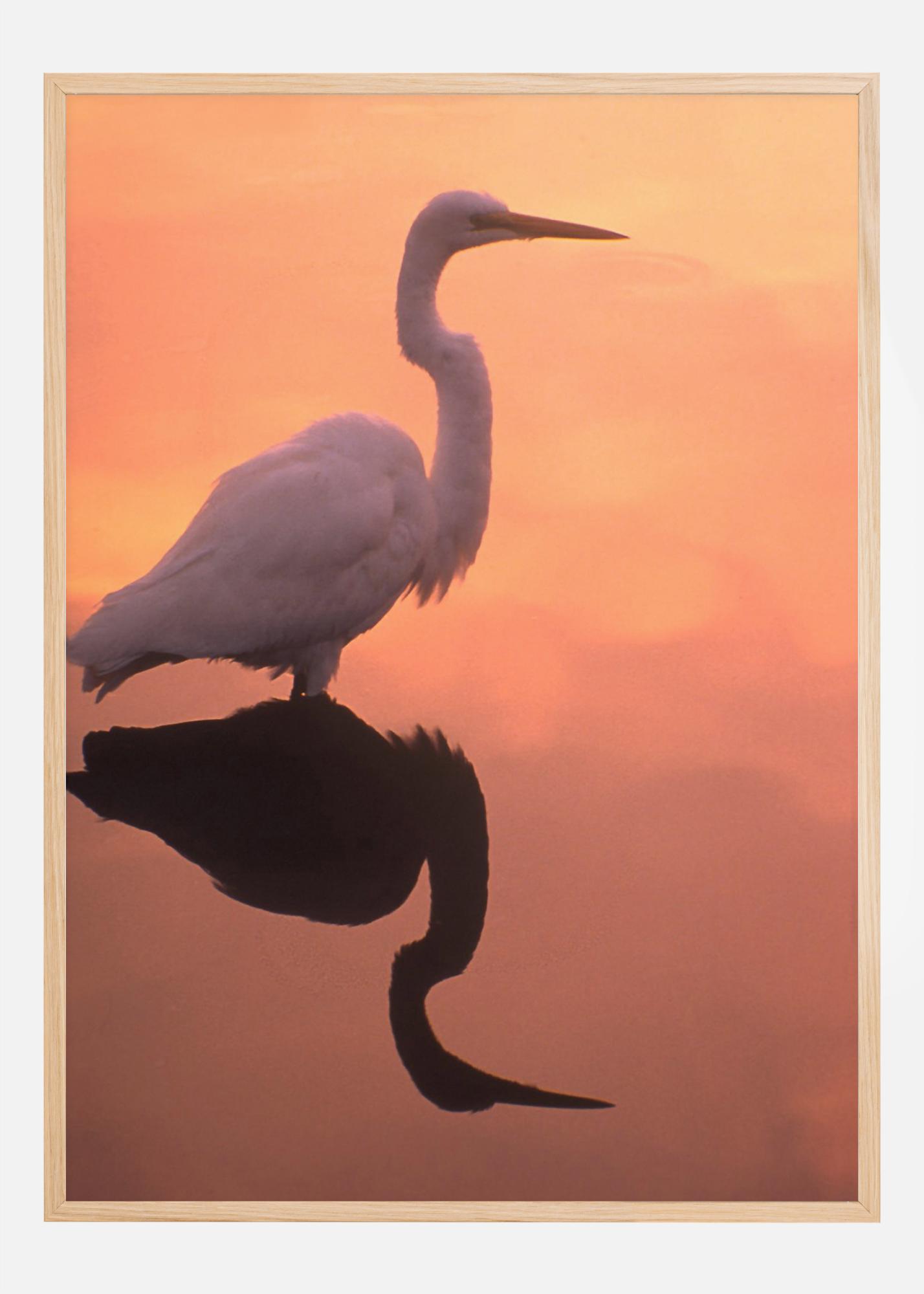 Un poster di una natura selvaggia con una cicogna bianca su uno splendido cielo arancione. Il semplice riflesso della cicogna nell'acqua mostra anche il cielo riflesso. I colori arancione e giallo morbidi sono perfetti per donare calore e tranquillità alla casa.