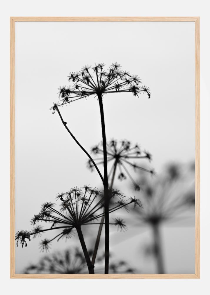 Un semplice poster con fiori su uno sfondo bianco. Le silhouette nere dei fusti e delle teste dei semi di queste piante contrastano con lo sfondo bianco semplice. Appendi questa affascinante immagine su una parete colorata per far risaltare i dettagli dei fiori.