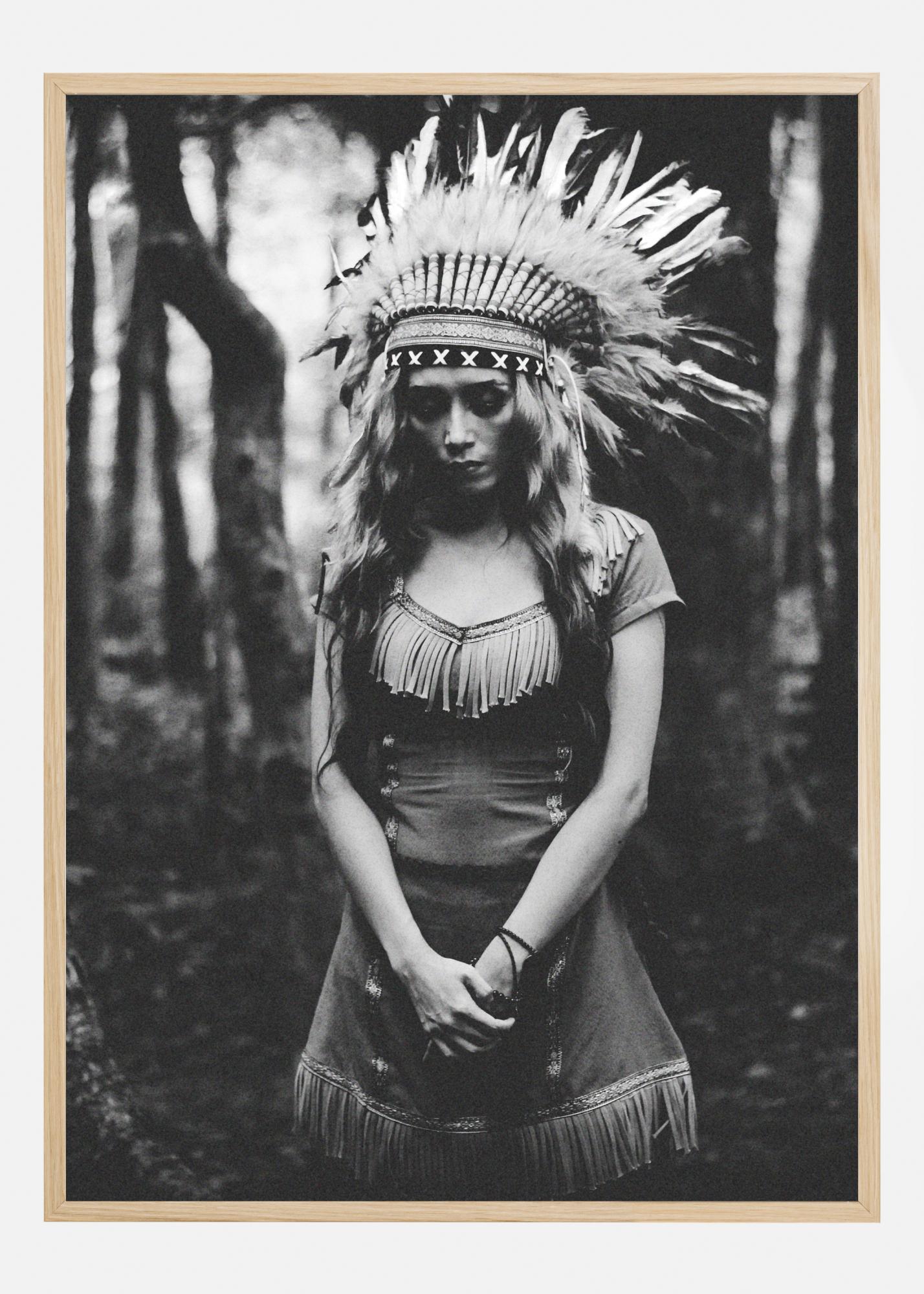 Un ritratto di una ragazza indiana nel bosco. Questa forte immagine in bianco e nero fa risaltare le piume bianche sulla sua testa contro il tronco scuro dell'albero. Lasciati vivere un momento di riflessione mentre abbassa lo sguardo sulle sue mani giunte.