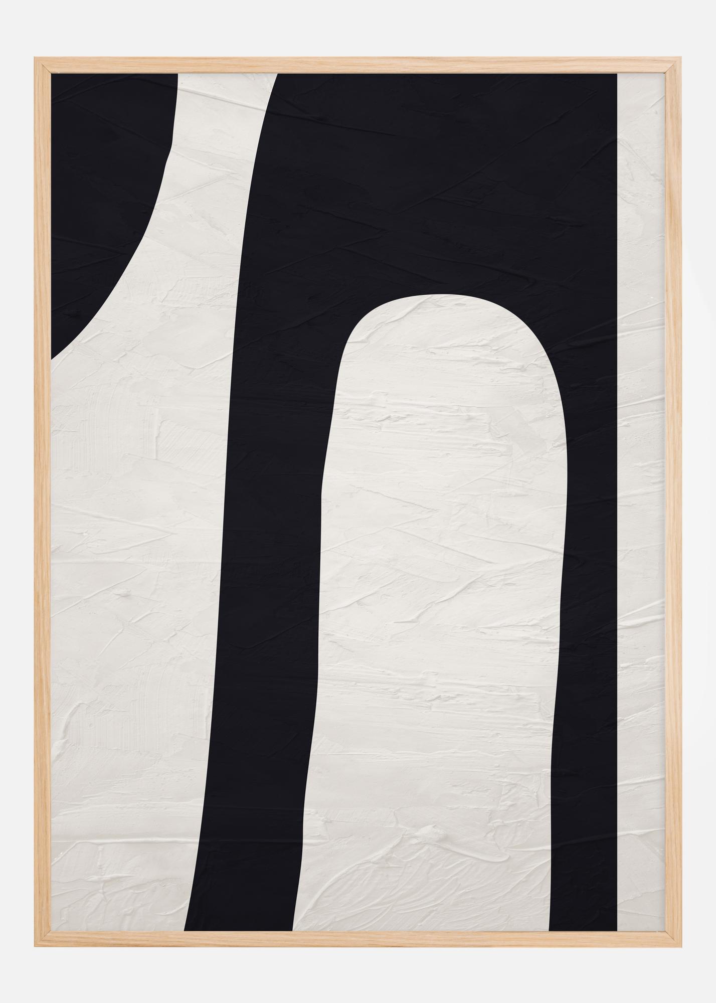 Questo poster artistico presenta un gioco di linee nere astratte su uno sfondo bianco crema, creando un forte e visivamente stimolante contrasto. Il design gioca su spazio e prospettiva utilizzando la forma delle linee nere per suggerire dimensione e profondità. È un'immagine minimalista ma potente che bilancia tra arte moderna e design grafico.
