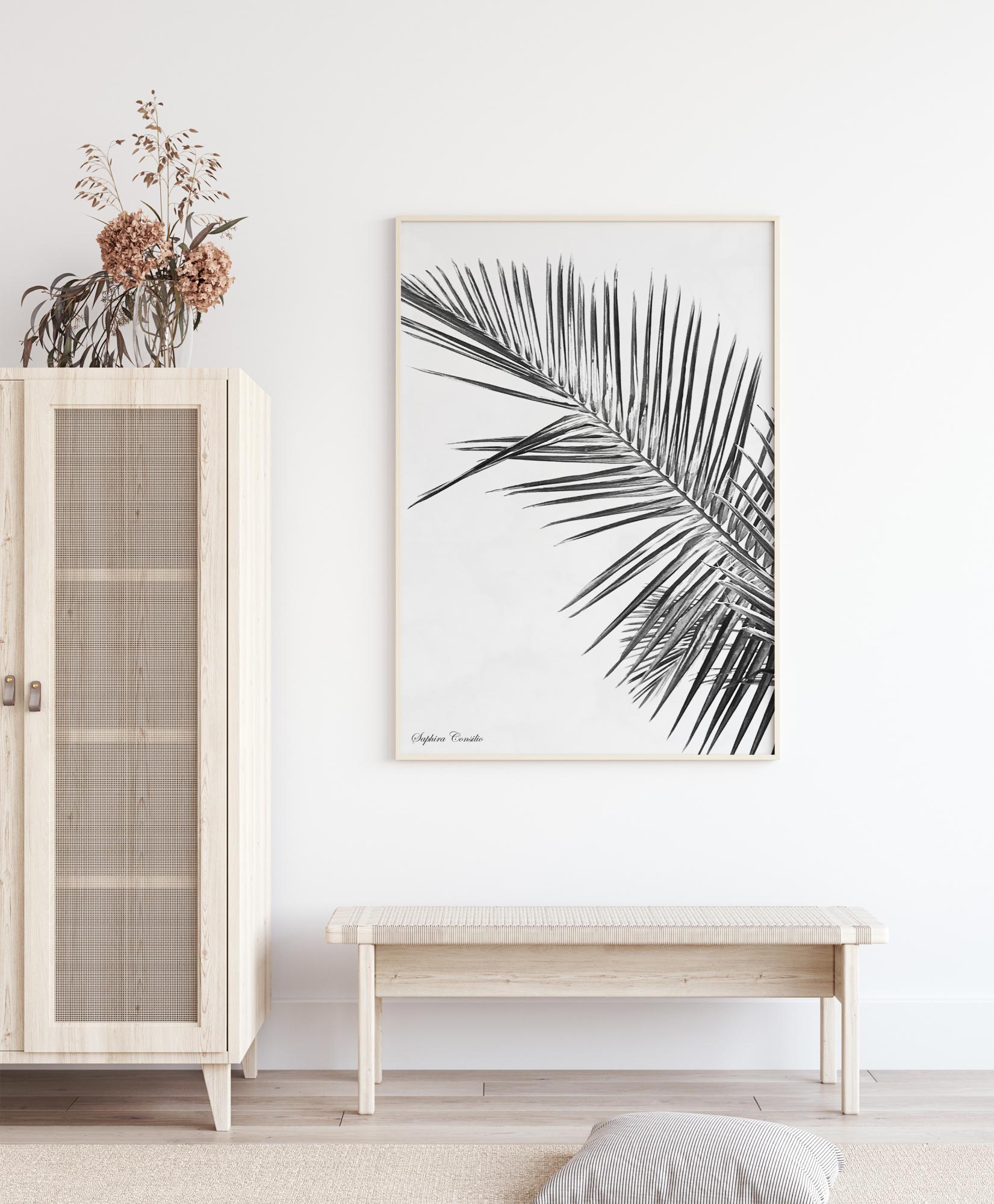 Una fotografia in scala di grigi di un ramo di palma, creata dal fotografo Saphira Consilio. Un poster minimalista che si adatta perfettamente a case moderne o ispirate al design retrò. Puoi abbinarlo ad altri prodotti del nostro assortimento di Saphira Consilio per creare una grande parete di quadri.