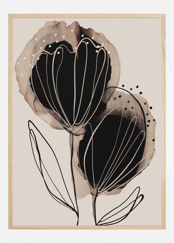La palette di colori è limitata ma potente, con dettagli neri e bianchi che mettono in risalto le linee grafiche delle forme floreali su uno sfondo dai colori terrosi. Questa stampa è perfetta per aggiungere un tocco contemporaneo a qualsiasi stanza ed è particolarmente incisiva in ambienti minimalisti o moderni dove la sua bellezza elegante può essere al centro dell'attenzione.