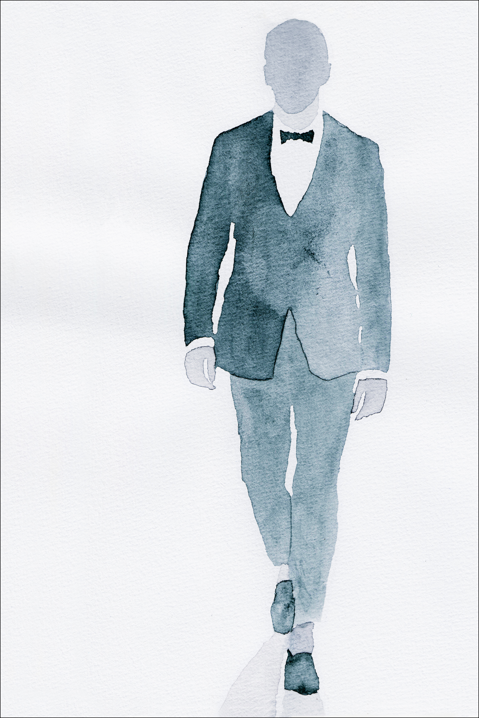 Un poster ritratto di un uomo in smoking che cammina. Semplice ma allo stesso tempo suggestivo, questo dipinto blu mostra la figura senza rivelare alcun dettaglio. Chi è l'uomo misterioso? Sta a te decidere quando appendere l'immagine a casa.