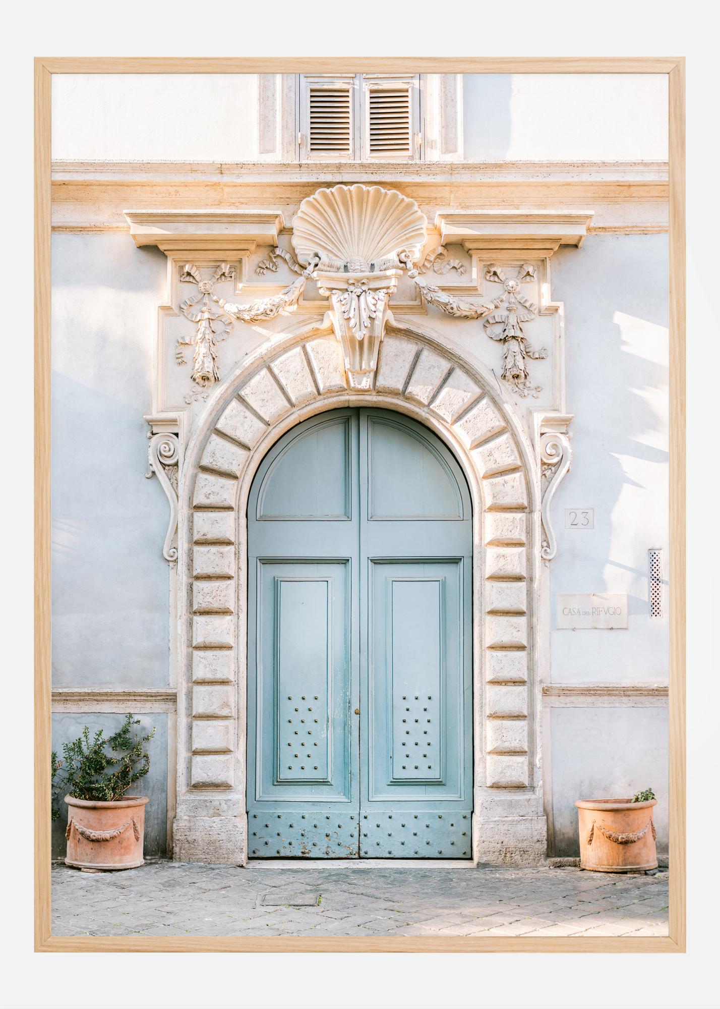 Questo poster cattura la bellezza e il fascino di un'architettura classica europea. La porta doppia azzurro chiaro è circondata da un elegante portale in pietra, con dettagli finemente scolpiti e ornamenti che donano una sensazione di ricchezza storica e patrimonio culturale. Sopra la porta si trova un imponente arco a forma di conchiglia che completa questa maestosa entrata. Su ciascun lato della porta si trovano vasi con piante verdi, che aggiungono un contrasto naturale e vivace alla facciata in pietra. Questa immagine emana un'atmosfera calma ed elevata, perfetta per aggiungere un tocco di bellezza classica in ogni casa.