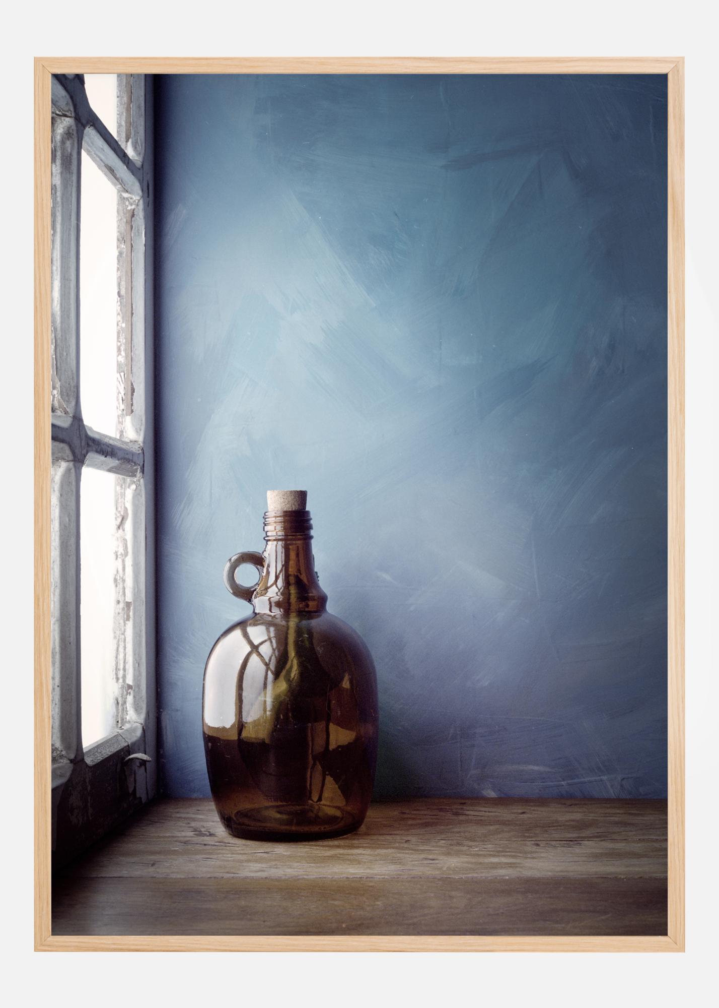 Un poster di natura morta con una bottiglia marrone contro una parete blu. La luce proveniente da una finestra illumina da sinistra, illuminando la bottiglia e creando riflessi. Aggiungi un tocco rustico alla tua casa con la parete blu morbida e il vecchio tavolo di legno su cui si trova la bottiglia.