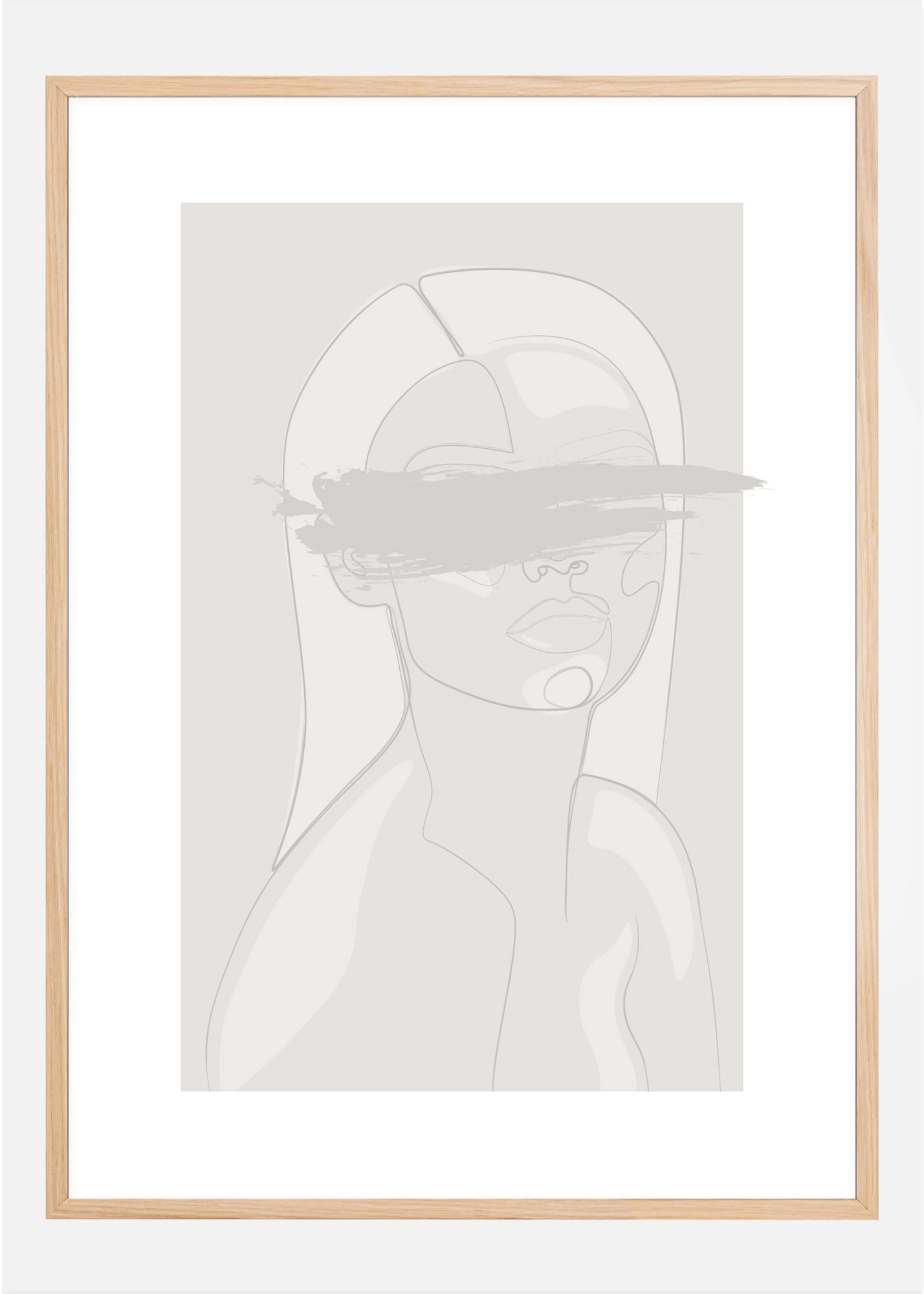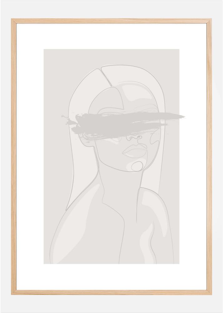 Un poster astratto con una donna dagli occhi coperti. Questa immagine pallida bianca e grigia mostra la testa e le spalle di una donna in forme a blocchi e linee. Una spruzzata di colore copre gli occhi, creando mistero intorno alla donna. Un forte bordo bianco la incornicia, perfetto per essere appeso su una parete colorata audacemente in casa.