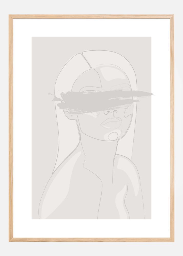 Un poster astratto con una donna dagli occhi coperti. Questa immagine pallida bianca e grigia mostra la testa e le spalle di una donna in forme a blocchi e linee. Una spruzzata di colore copre gli occhi, creando mistero intorno alla donna. Un forte bordo bianco la incornicia, perfetto per essere appeso su una parete colorata audacemente in casa.