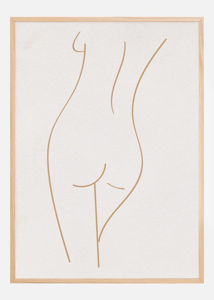 Un semplice poster disegnato con una donna di spalle. Sottili linee marroni sono tutto ciò che serve per creare la forma di questa donna che si sta mettendo in posa da dietro. Le linee guidano lo sguardo verso l'alto lungo la schiena in questo disegno semplice ma elegante su uno sfondo bianco.