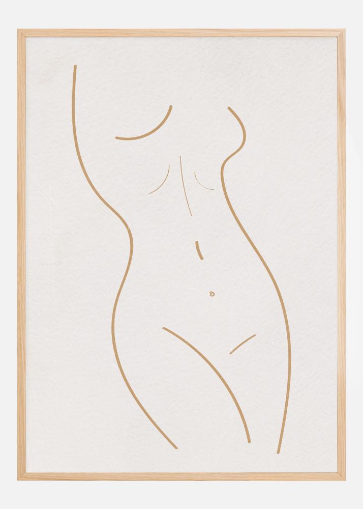 Un poster con una donna in linee marroni. Linee marroni forti e audaci delineano le gambe, il ventre e il seno della donna. Le linee sono uniformi e ascendenti in questo elegante disegno. Appendi questa opera su una semplice parete bianca per creare un'atmosfera da galleria d'arte.
