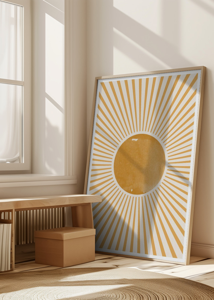 Questo poster vivace evoca la sensazione di un sole splendente con le sue linee irradianti in tonalità dorate che circondano un cerchio giallo centrale su uno sfondo bianco morbido. Il design è ispirato a motivi bohemici e geometrici, che insieme creano un'immagine del calore e dell'energia del sole. I colori caldi e il motivo radiante sono progettati per dare una sensazione di gioia e positività.