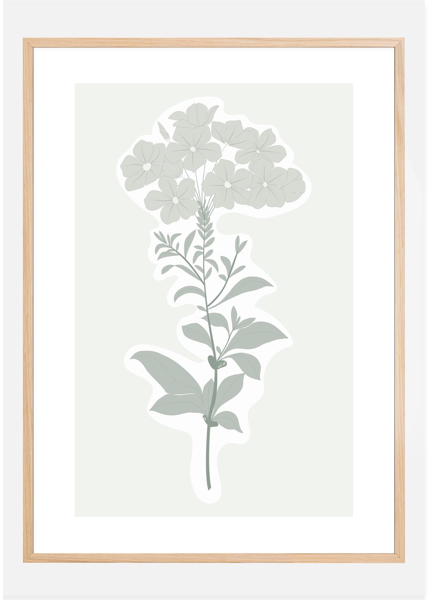 Un poster con una semplice stampa botanica di un fiore e delle sue foglie. I colori grigi-verdi morbidi compongono questo stelo semplice ma elegante con i fiori. Incorniciato in bianco e grigio, questa stampa evoca ricordi delle illustrazioni botaniche d'antan. Mostra un pezzo del tuo giardino con l'aiuto di questa deliziosa stampa.